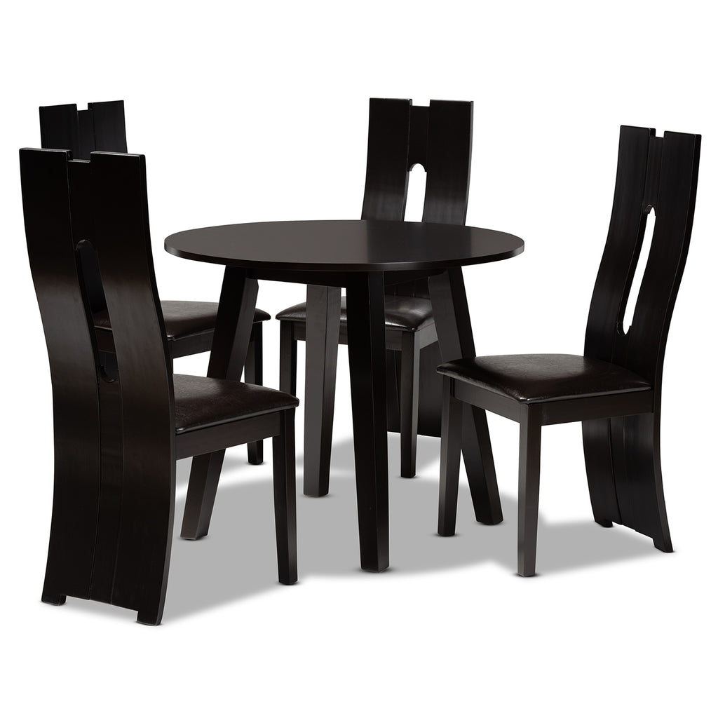 A unique blend of modern comfort and minimalist design, the Torin dining set adds character to any space. Made in Malaysia, the Torin is constructed from sturdy wood and includes four chairs and one table. Plush foam-padded seats covered by smooth faux leather provide a comfortable embrace while the circular tabletop allows for ample elbow room for each member of the table. Requiring assembly, the darker tones of the Torin allow the set to easily blend in with modern home layouts. A cozy choice equipped with lavish comfort, the Torin dining set is an excellent addition to any home.
