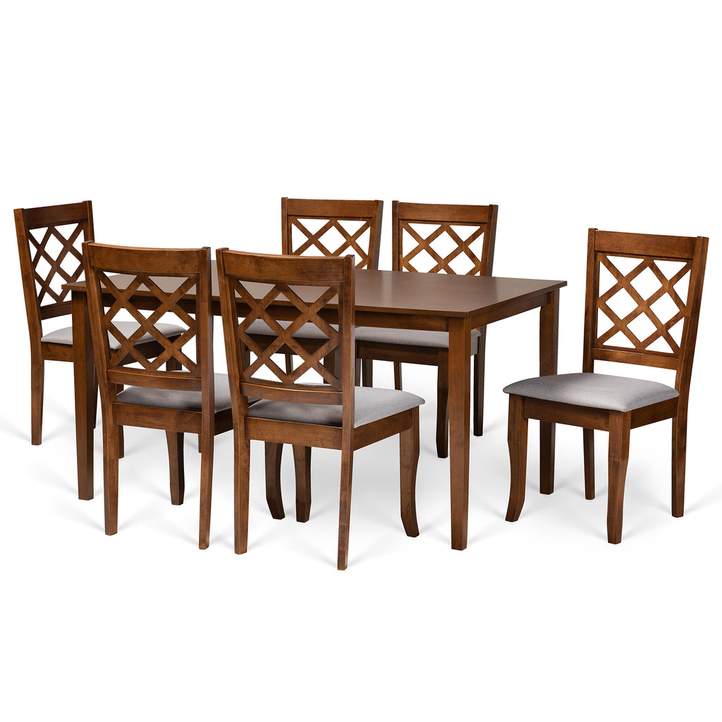 Casual elegance defines the Verner dining set. Made in Malaysia, this wooden set includes one table and six chairs, each upholstered in a light fabric that complements the warm walnut brown wood finish. Foam padded seats provide endless comfort during long dinners with friends and family. Each chair features an exquisite cut-out design on its back for a light, airy feel, while cabriole legs lend a classic look. Requiring assembly, the large, rectangular tabletop ensures plenty of elbow room for each member of the table. Perfect for both casual and formal occasions, the Verner dining set easily elevates any dining experience.