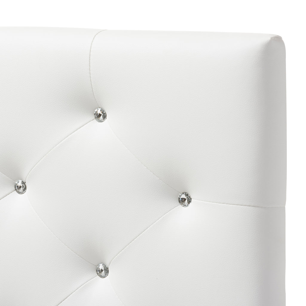Straight lines and button-back detailing offers your sleep space a plush symmetry with the Viviana upholstered twin headboard. Impart a unique elegance into your bedroom interior with this classic piece of furniture. The Viviana is constructed of quality hardwood frame and is cushioned with high density foam for softness and shape. For an ultra-elegant look, the white faux leather headboard is button tufted with faux crystal buttons. The headboard sits between the wall and the ensemble frame, attaching not to the bed base but to the legs, for stability. The leg supports are invisible once set up and can be adjusted to suit the height of your ensemble for convenience. Made in Malaysia, the headboard requires assembly.