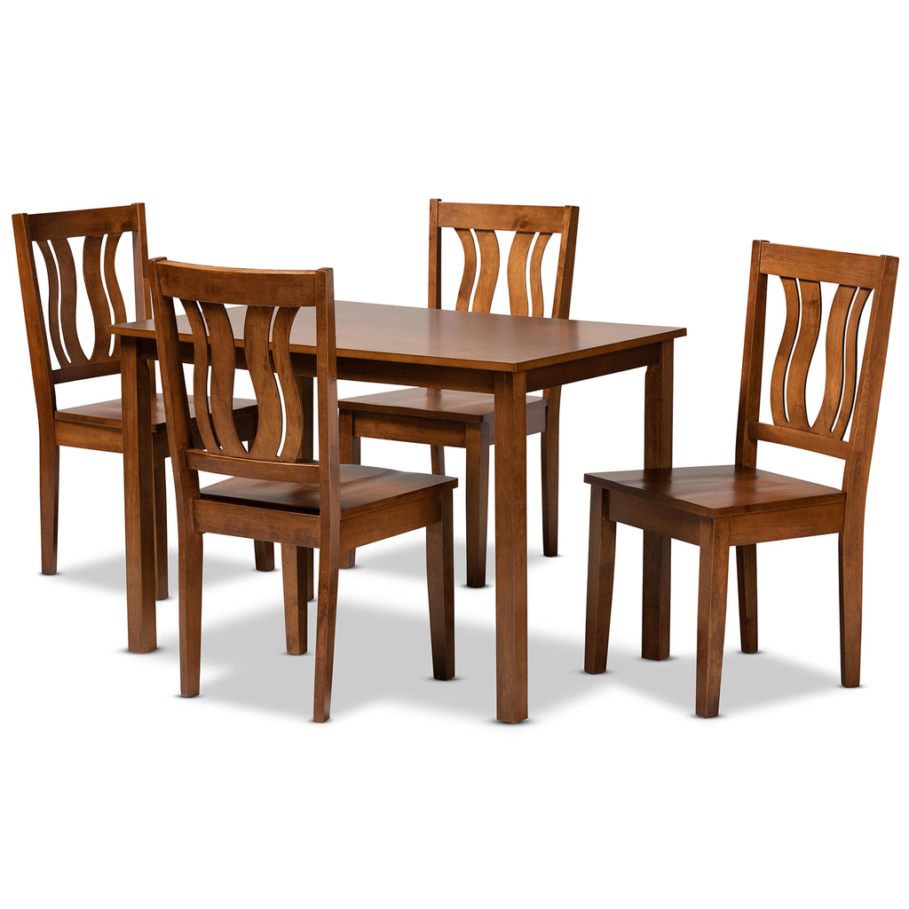 Featuring a unique, visually striking design, the Zamira dining set adds elegance to any dining space. Made in Malaysia, this wooden set includes four chairs and one table showcasing a warm walnut brown finish. Each chair features a unique, geometric cut out design on its backrest for added visual appeal, while a scoop seat lends casual comfort. Requiring assembly, the rectangular tabletop provides ample elbow room for each member of the table. Emanating graceful charm, the Zamira dining set is an exceptional addition to the modern home.