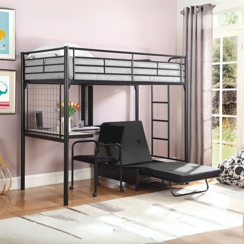 - Contemporary twin workstation loft bed with a futon frame in glossy black finish saves precious space.