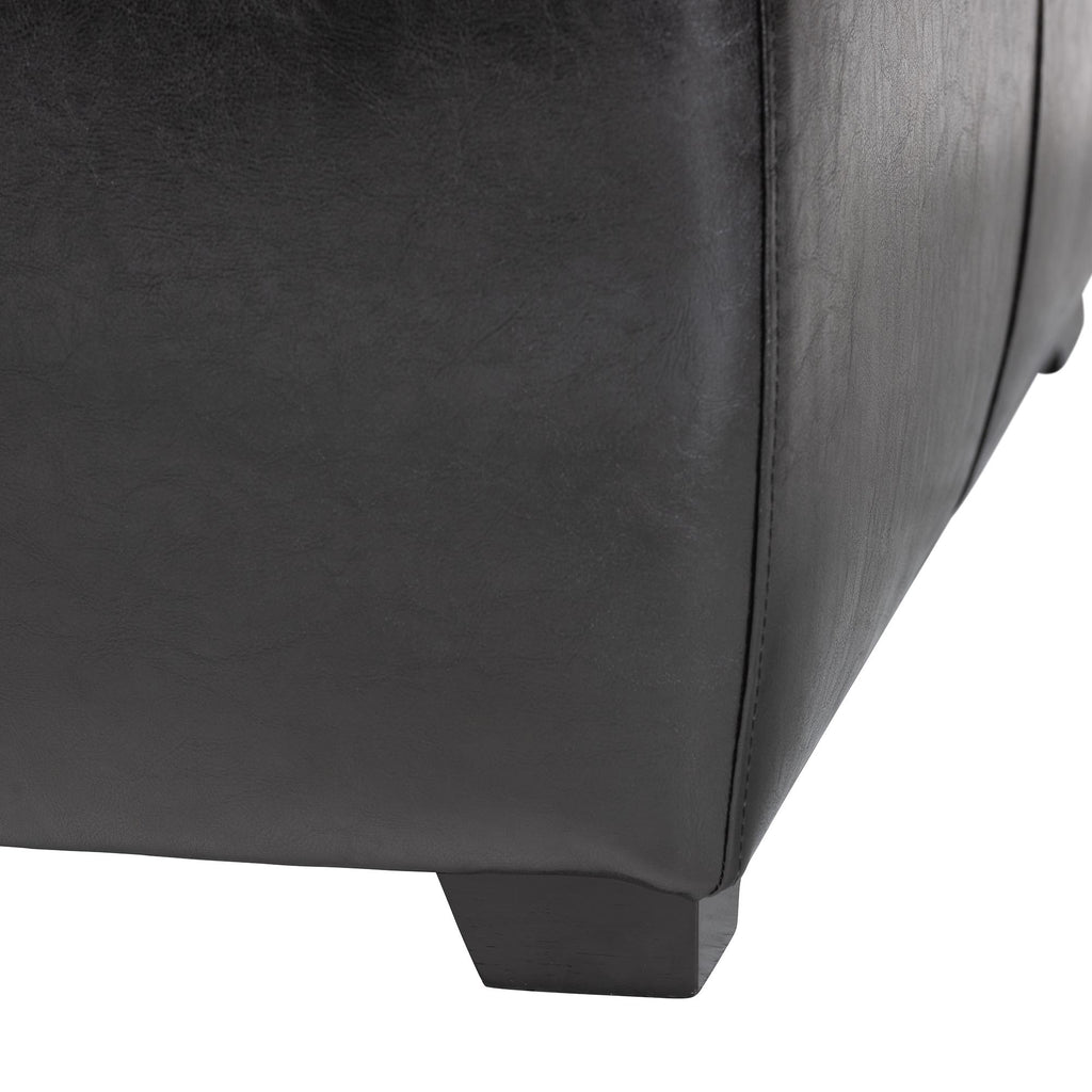 Square Leather Ottoman is built with a robust wooden frame, covered in high-bi-cast leather, featuring a comfortable foam filling, and designed with a sleek, modern aesthetic complemented by piped edging.