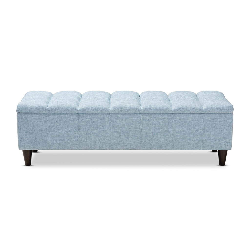 Add style and utility to any space with the Brette storage ottoman. This chic ottoman features a streamlined design that makes it easy to coordinate with a wide range of decor styles. Upholstered in a soft, durable polyester fabric, the lid is foam-padded and biscuit tufted to provide the utmost sitting. The ottoman features a storage compartment under the lid, providing space to store extra blankets and pillows. Tapered, dark brown-finished wood legs add mid-century modern appeal. Use this versatile piece in the entryway, living room, or bedroom. The Brette storage ottoman requires assembly.