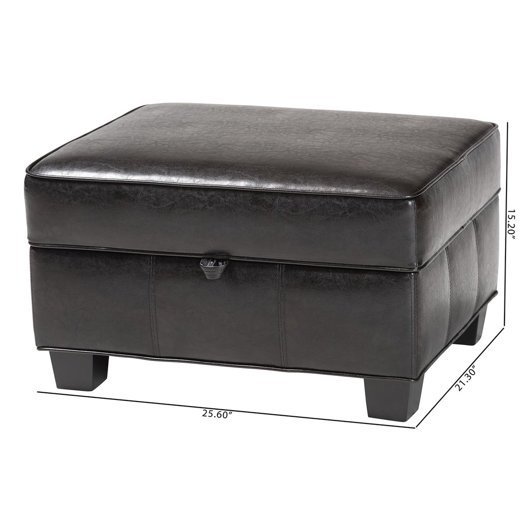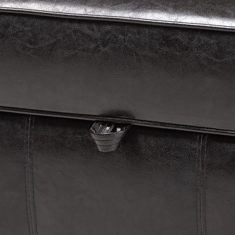 This traditionally designed bycast leather ottoman offers optimal functionality while effectively saving space. The lid is well-padded, making it a comfortable footrest or stool, and it lifts effortlessly to uncover a cleverly concealed storage compartment. The two included safety hinges, the lid of the storage ottoman will stay propped open. Both the interior and the bottom are lined with brown fabric, and each leg is equipped with opaque plastic floor protectors.