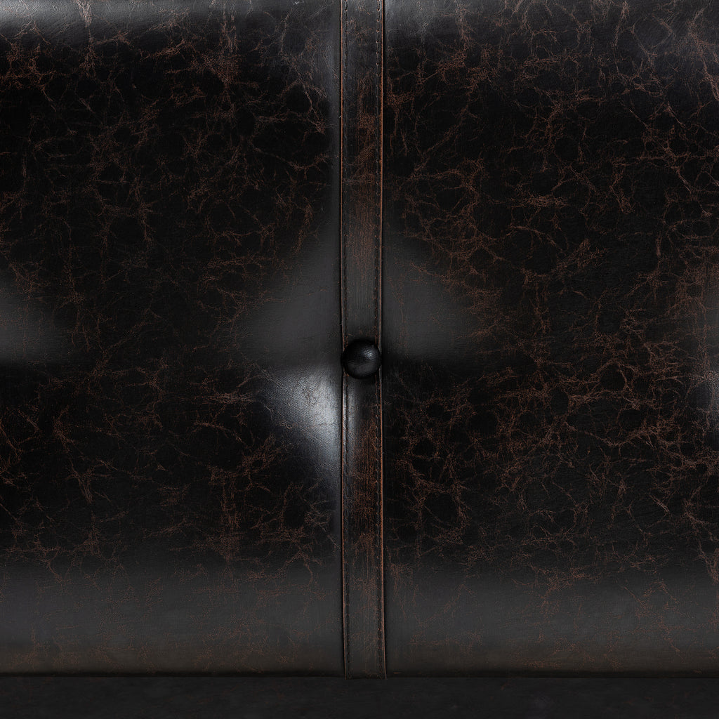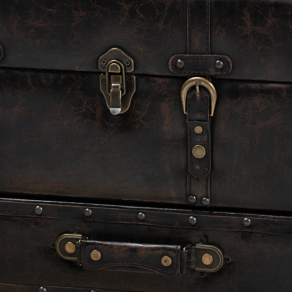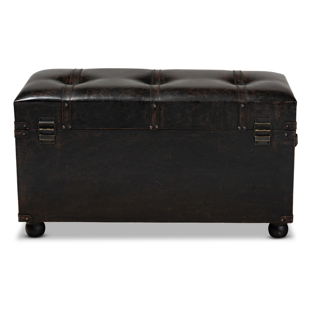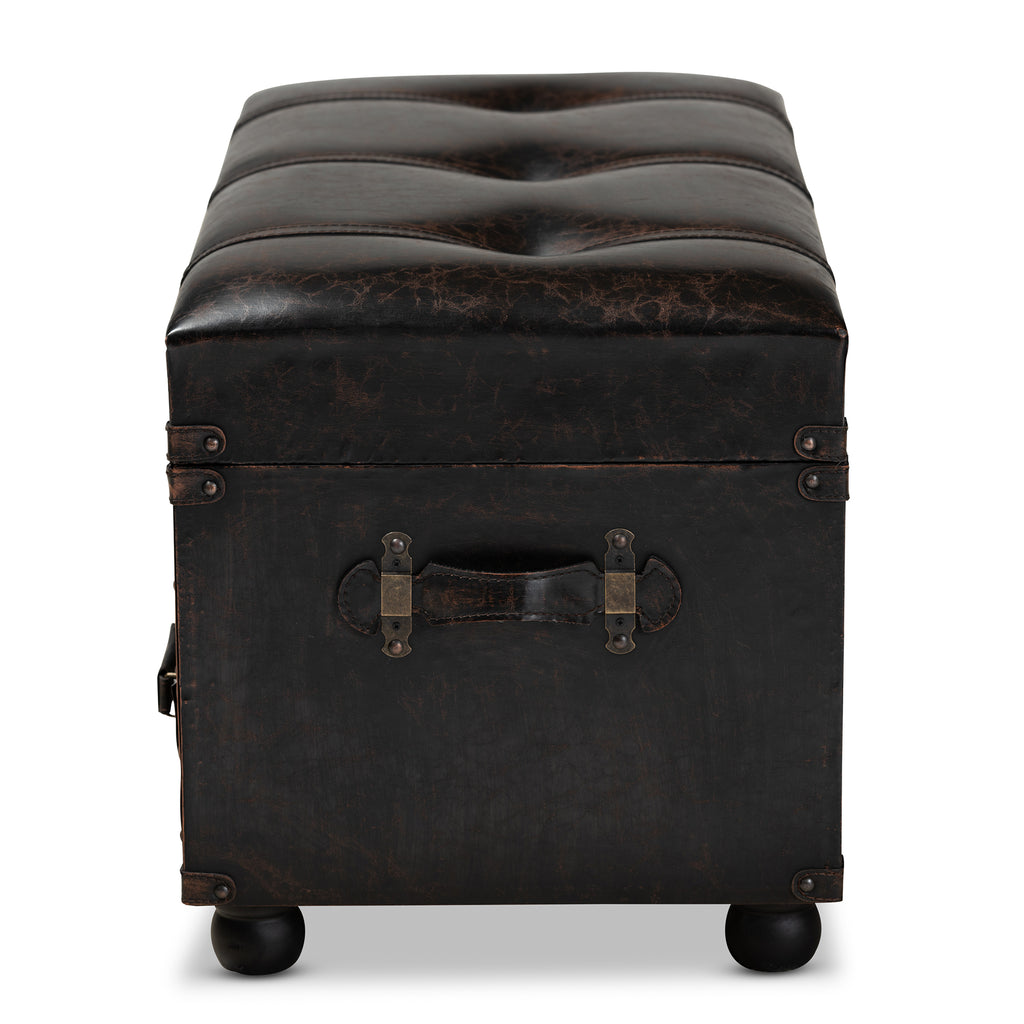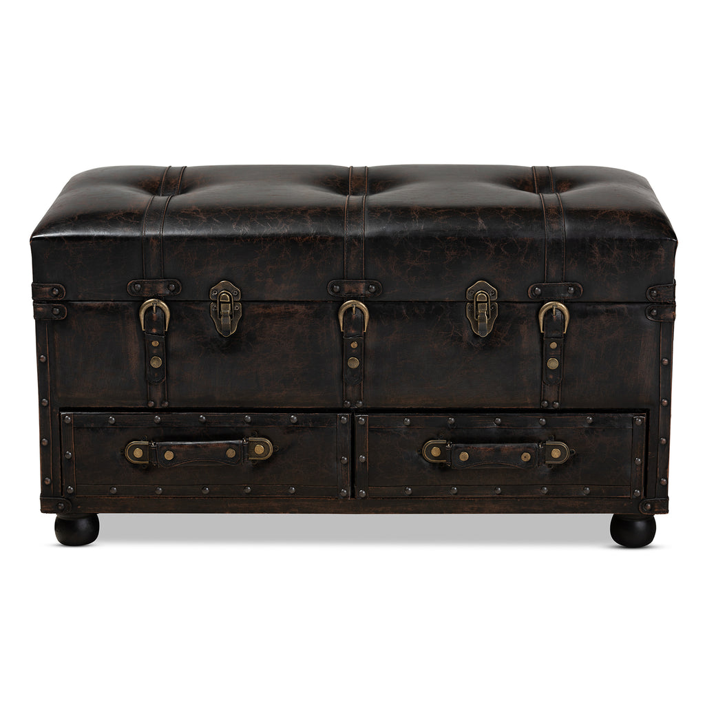 Stylish and versatile, the Callum ottoman is an easy addition to any space. Set on top of black bun feet, the Callum is upholstered in a distressed dark brown faux leather for an authentic antique look. Ample storage space is located beneath the cushioned lift-up lid, as well as in two drawers situated at the bottom. Inspired by vintage steamer trunks, the Callum is accented with antique brass buckles and latches. Antique bronze nailheads and button tufting add an extra dose of style. The Callum ottoman arrives fully assembled.