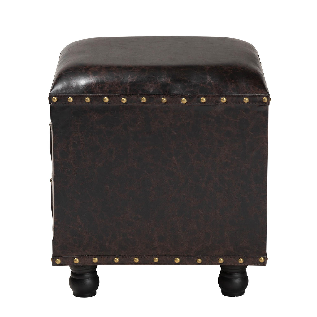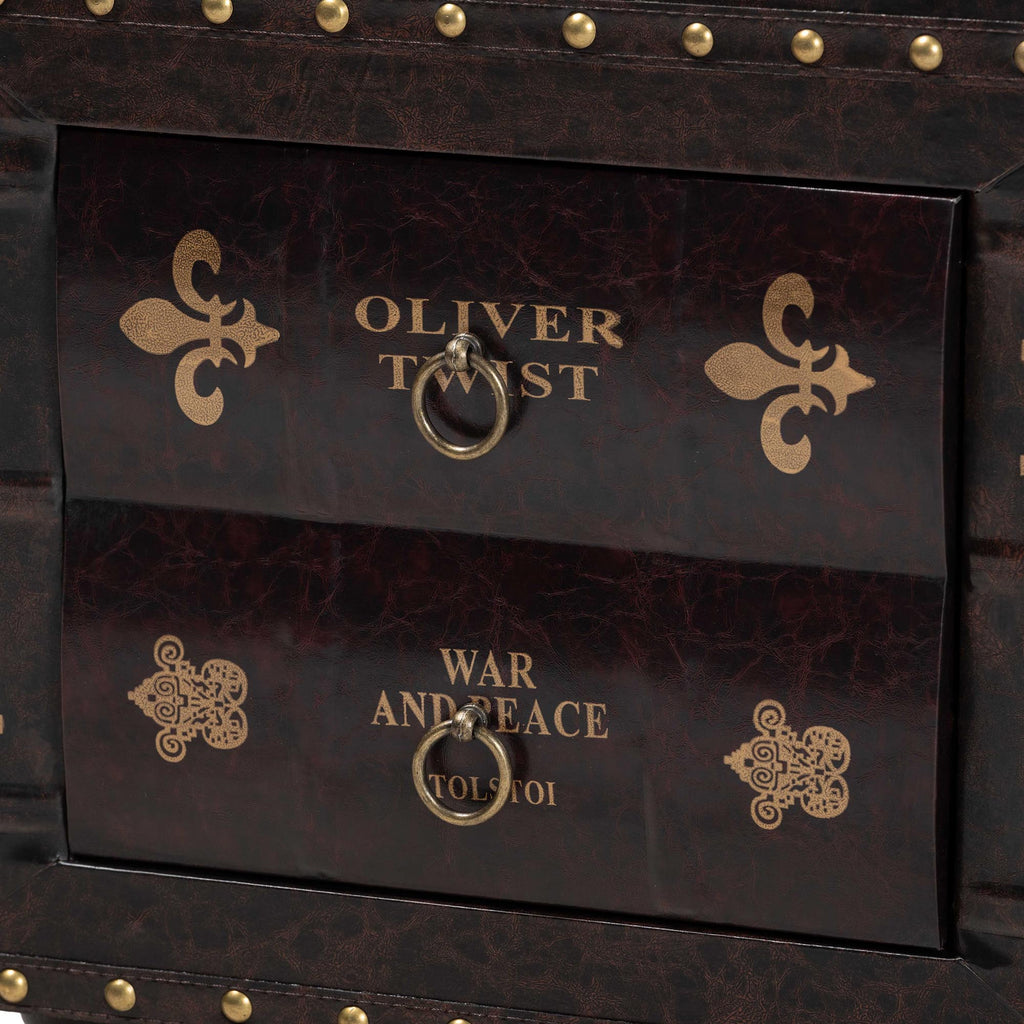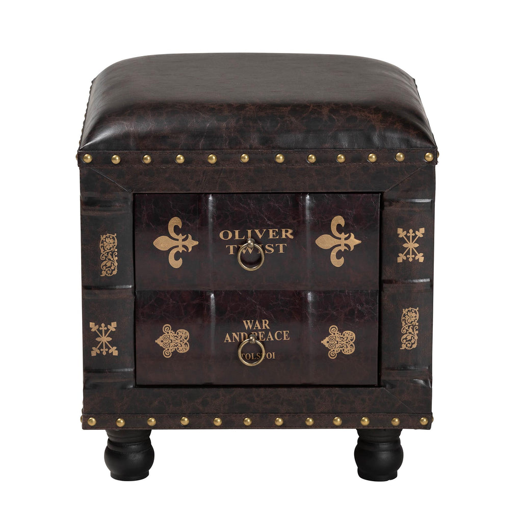 Designed for lovers of classic literature, the Charlier ottoman features a unique drawer styled to resemble antique book spines. Crafted from durable MDF wood, it showcases a distressed dark brown finish that evokes timeless, old-world character. A single pull-out drawer offers convenient storage for blankets, linens, or other essentials. The drawer front is detailed with the titles of two classic books and a fleur-de-lis motif, enhancing its vintage appeal. Combining both seating and storage, the ottoman is topped with a dark brown faux leather cushion, padded with foam for Brass nailhead trim and traditional bun feet complete the design. The Charlier ottoman arrives fully assembled.