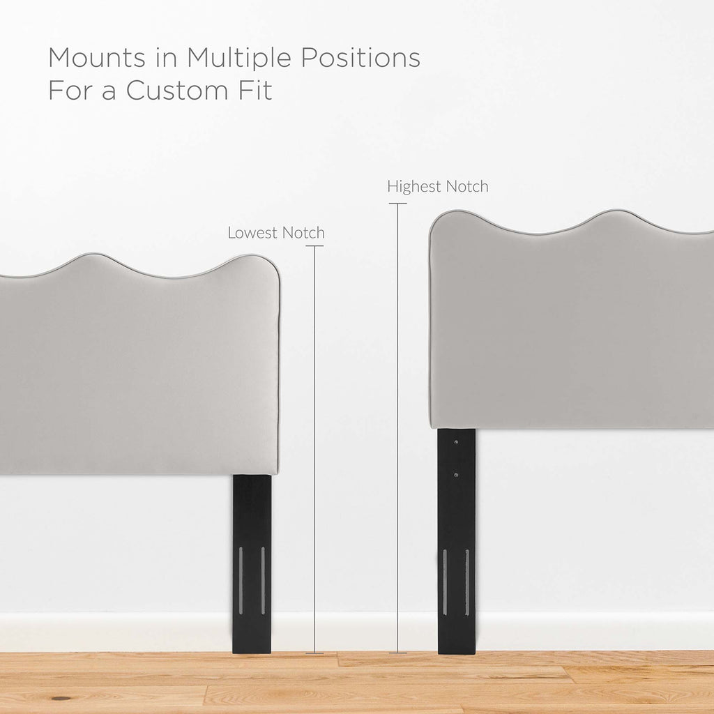 Bring the imagery of waves crashing against the shore to a master bedroom or guest suite with the Current Performance Velvet Queen Platform Bed. Putting a modern twist on a classic scalloped design, the queen headboard of this platform bed features texture and a silhouette inspired by the ocean waves while dense padding offers a supportive place to sit back and relax while sitting up in bed. Covered in stain-resistant performance velvet, this upholstered bed frame is a sturdy mattress foundation for memory foam, innerspring, latex, and hybrid mattresses. Eliminating the need for a box spring, the MDF frame of this queen bed is complete with a wood slat support system crafted with poplar for lasting durability and support. This slatted bed frame rests on black wood legs with non-marking foot caps and includes a reinforced center beam with two support legs for enhanced stability. Assembly required. Weight Capacity: 800 lbs.