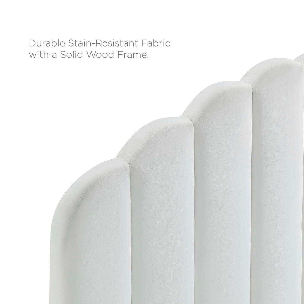 Claim the subtle of vintage in your master bedroom or guest room with the Daisy Channel Tufted Performance Velvet Queen Platform Bed. With a whimsical profile, this queen bed features vertical channel tufting and scalloped edge to present style in the bedroom. The padded queen headboard and side rails come covered in soft, stain-resistant performance velvet upholstery that grants texture. Resting atop tapered black wood legs, this platform bed frame crafted with MDF and LVL is a sturdy mattress foundation for memory foam, innerspring, latex, and hybrid mattresses. With supporting legs and a reinforced center beam, this upholstered bed is complete with a poplar wood slat support system that offers lasting stability. Mattress not included. Assembly required. Queen Bed Weight Capacity: 800 lbs.