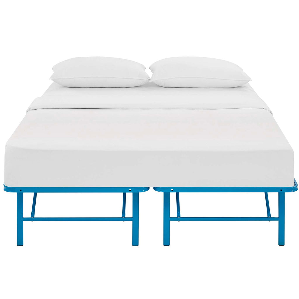 Horizon Metal Bed Frame. Horizon is made with a reinforced stainless steel metal base for long-term and uses with a generous 14 inches of space underneath to store hobby collections or seasonable clothing bins. Horizon comfortably supports up to 1300 lbs, easily folds away when not in use, and eliminates the need for a box spring with its heavy duty platform frame construction. Complete with non-marking foot caps to keep your carpets and floor safe, Horizon is a low profile modern bed frame that supports the standard mattress types on the market: memory foam, spring, latex or hybrids. Available in twin, full, or queen, Horizon reduces annoying squeaks and unpleasant bending or buckling, while transforming your home décor with a selection of stylish color options. Designed to provide lasting support for years to come, Horizon prevents saggy mattresses and increases the mattress lifespan while delivering a better-made bed frame solution for your home. No tools required. Mattress not included.