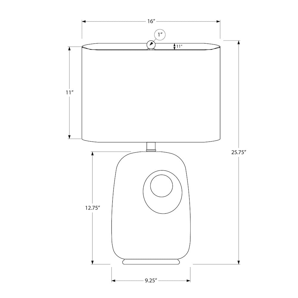 Illuminate your space with this modern and trendy 26"h table lamp with a sleek white ceramic base and topped with a linen-blend, ivory fabric shade. The architectural and contemporary cut-out design on this lighting piece will easily brighten and elevate your home decor whether placed on an end or side table, or on a nightstand as a chic decorative and functional accent. The convenient on/off rotary switch operates up to a 100W bulb (not included) to instantly brighten up a living room, office, or bedroom space. Only minimal assembly is required, and this eye-catching lamp will be ready to add some fashionable and functional ambiance to a room. Made with high quality materials, this decorative lamp is backed by a 2 year limited warranty against manufacturer defects for your satisfaction.