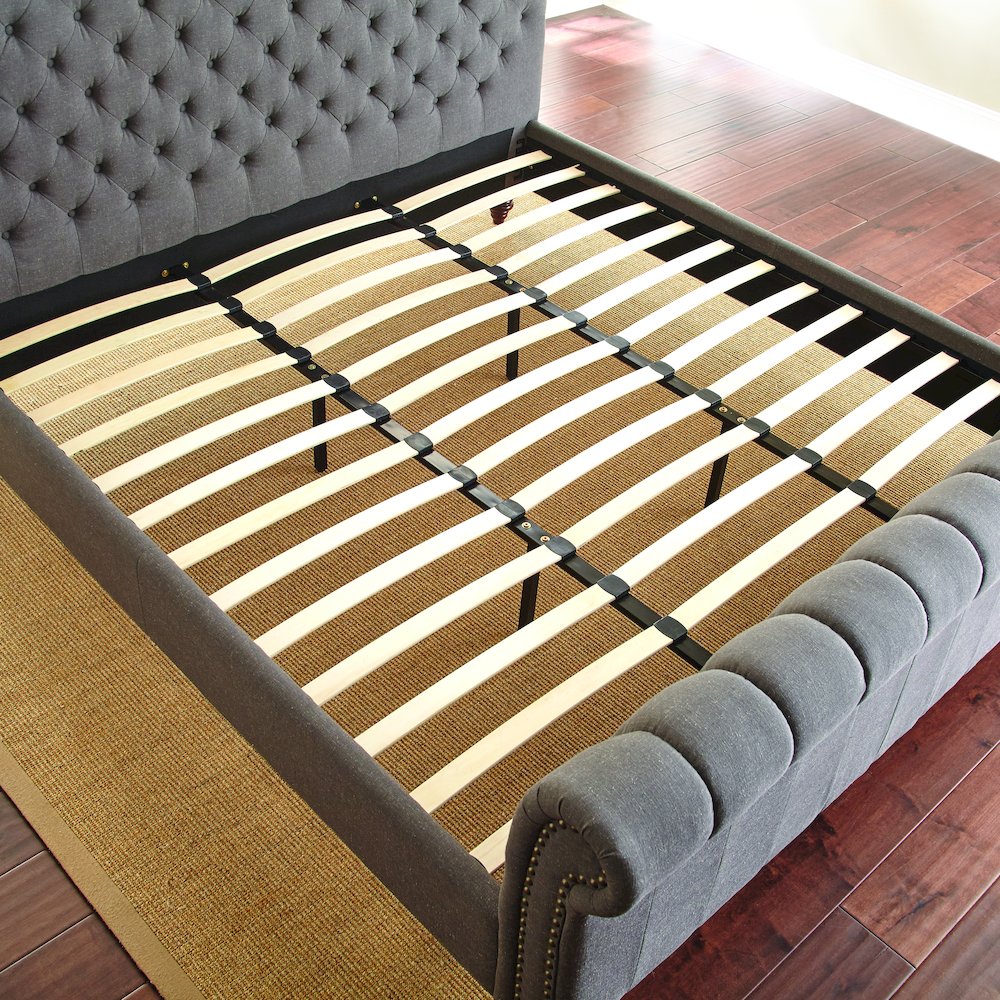 Relax in with the Swanson king size platform bed! This elegant bed shines with a tufted headboard and charming nail head accents. The stylish rolled headboard and footboard bring a touch of class to your room while ensuring you stay comfortable. The sturdy foundation features a 39-piece slat system with center supports, allowing you to use both a box spring and mattress, or go for a sleek platform look with just a mattress.