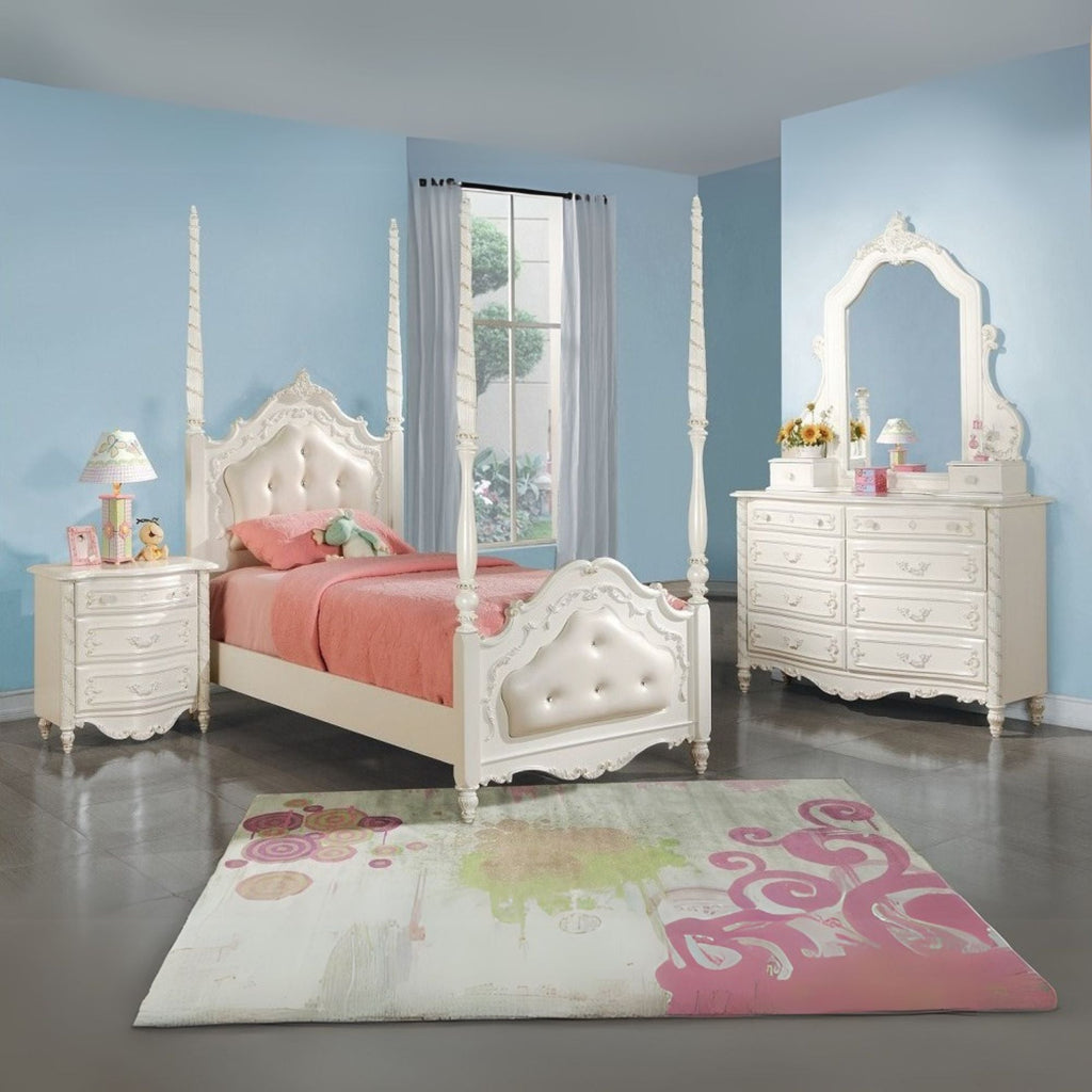 The Pearl youth bedroom collection reflects a romantic fairy-tale style. This collection features pearl white finish, delicate scrolling motifs with gold accents throughout. It also emphasizes the complementary bow front decorative carvings on all cases. All princesses will love the elegance found in this collection.