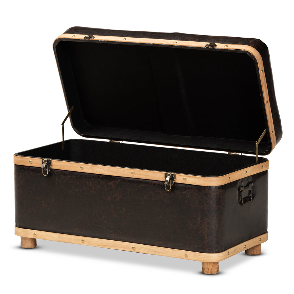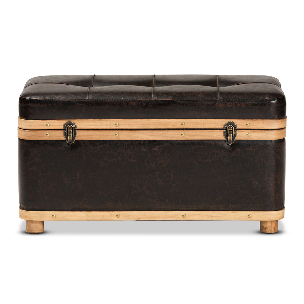 The Gendry storage ottoman blends rustic design with modern utility to organize your space in striking style. This ottoman is comprised of a sturdy wood frame upholstered in distressed dark brown faux leather. Its button tufted cushion is padded with plush foam to serve as a cozy footstool or as extra seating when needed. Fully assembled, its top lifts open to reveal spacious storage for blankets, pillows, and more. Oak brown finished wood bands lined with brass finished metal studs lend a contemporary touch that complements the dark upholstery. Ornate antique brass finished handles and latches complete the look, making the Gendry ottoman an outstanding solution to your storage needs.