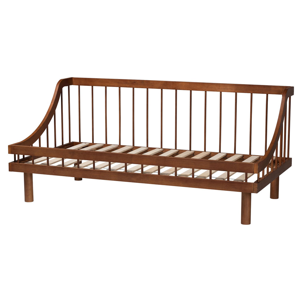 Uncover an air of ease with the graceful design of the Helio daybed. Made in , this mid-century inspired piece is crafted from sturdy wood. Its wraparound frame features a gorgeous spindle design while sloping arms create an inviting, warm display. The Helio requires assembly and utilizes wood slats for mattress support, eliminating the need for a box spring. Rounded legs adeptly complement the smooth geometry of the piece, making the Helio daybed a fantastic fixture of any layout.