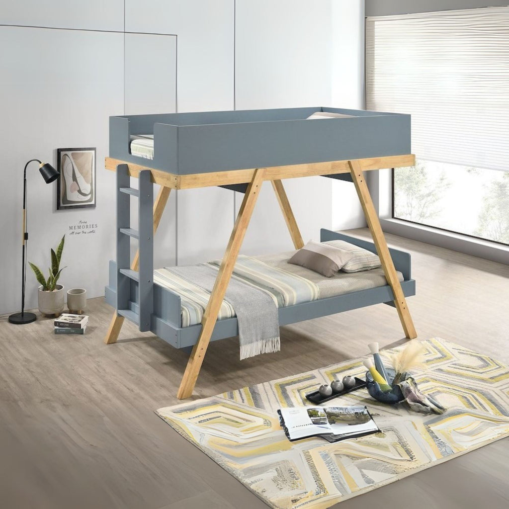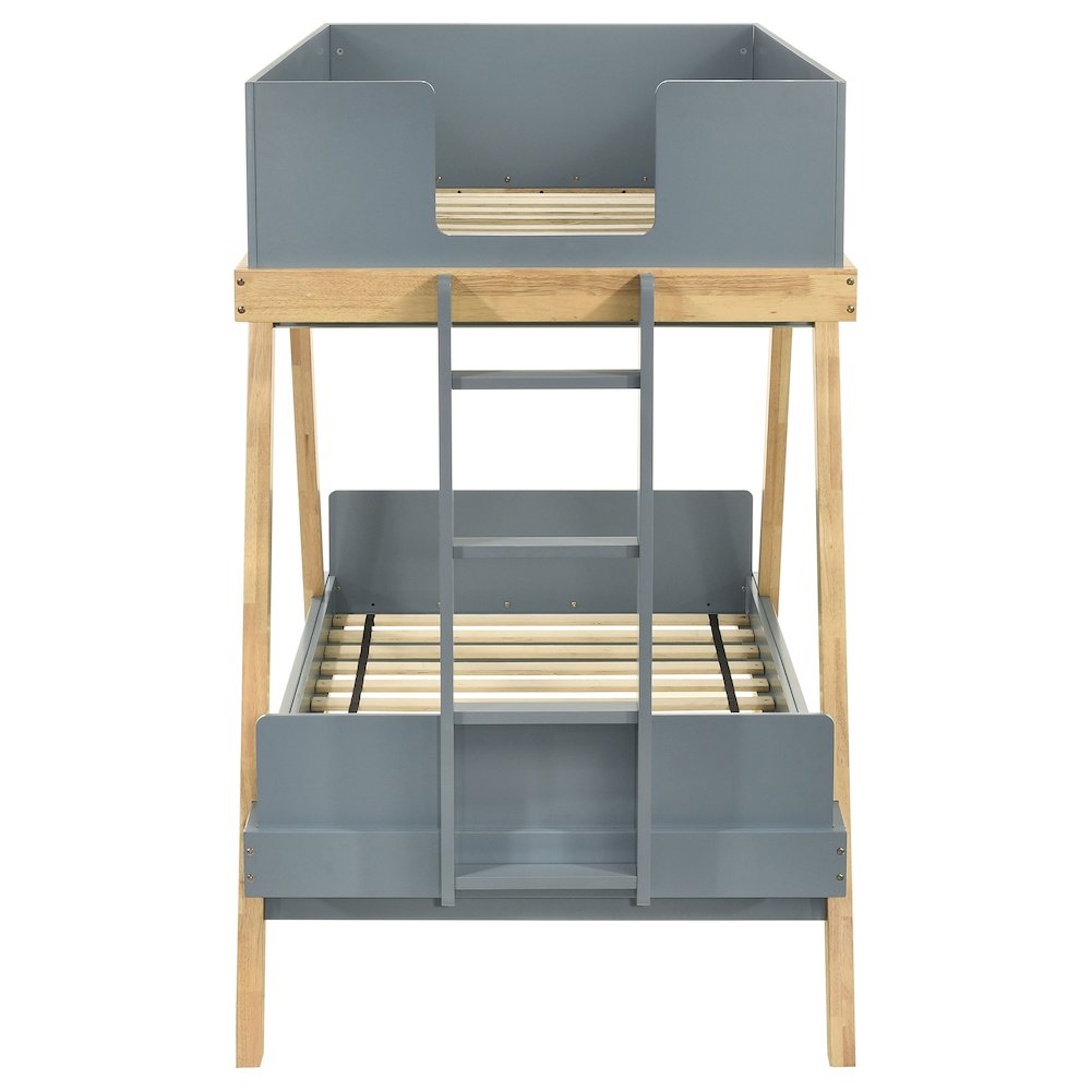 Refresh your child's bedroom with the farmhouse charm of this modern twin-over-twin bunk bed! Inspired by the classic trestle design, it s angled supports and a stylish two-tone finish that lights its character. The upper bunk is surrounded on three sides with solid panels for added safety, ensuring your little ones securely. The attached ladder provides easy access through the footboard, while the lower bunk has low head and footboards that give it a polished look.