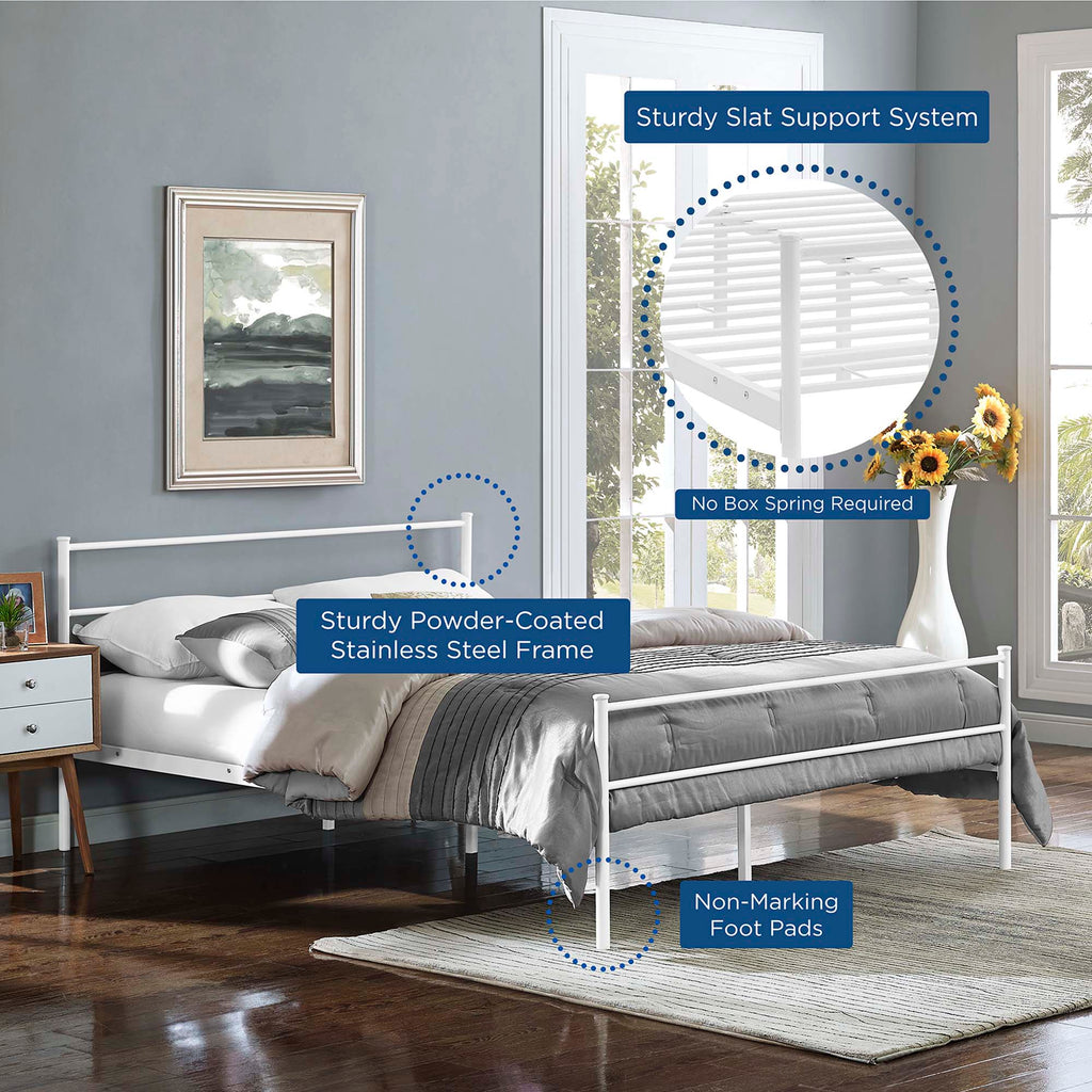 Find the blend of modern design and rustic charm with the Alina Platform Queen Bed. This strong and sturdy bed is built with a vintage-styled steel frame and a reinforced center beam, allowing it to support up to an impressive 1323 lbs. The Alina bed brings a calm and cozy atmosphere to your bedroom, making it ideal for cottage decor and country homes. It also eliminates the need for a box spring, so it works great with all kinds of mattresses, including memory foam, spring, latex, and hybrids. (Just remember, the mattress is not included!)