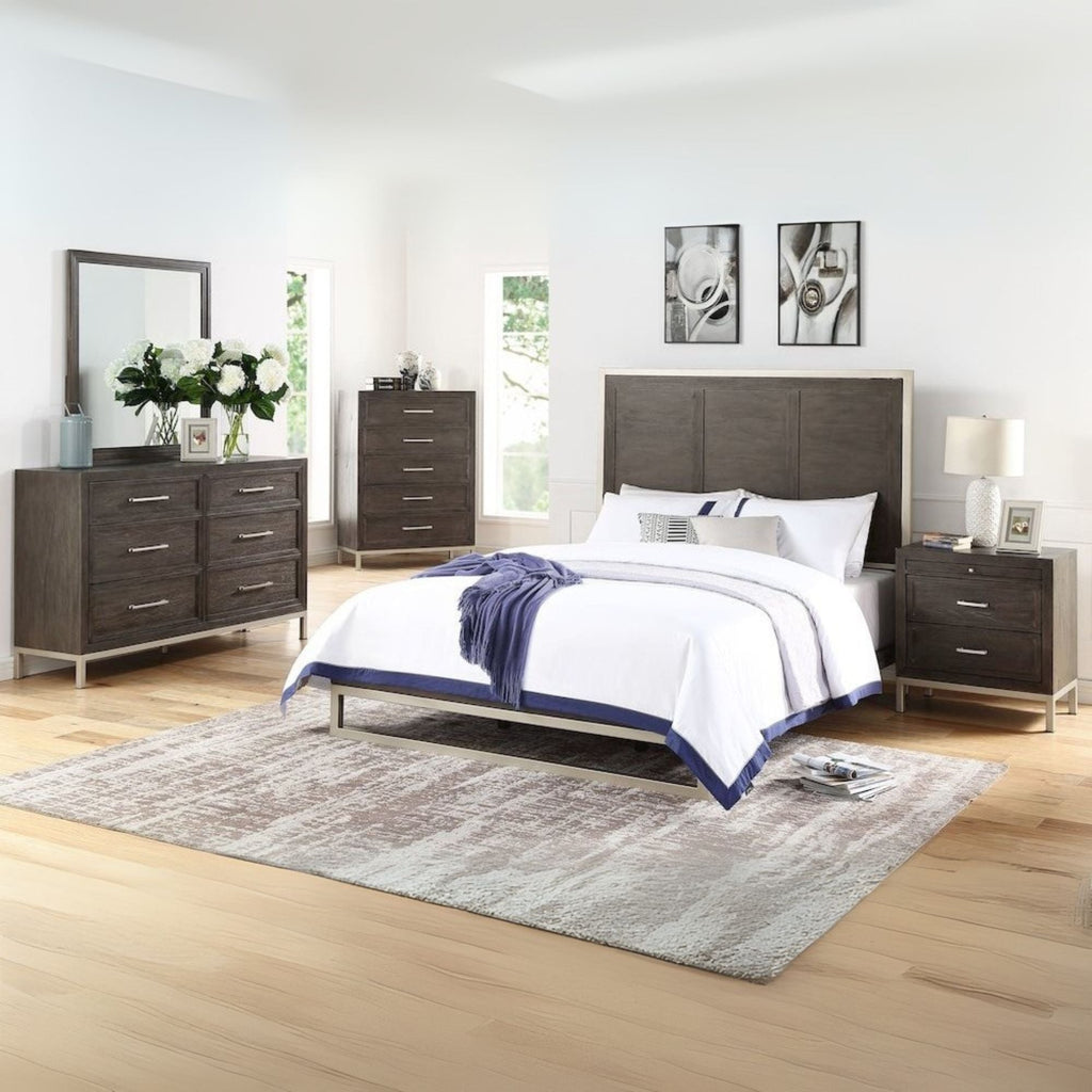 Introducing the Broomfield King Platform Bed, where modern design meets transitional style. This bed showcases a beautiful blend of clean lines and elegant materials. The warm walnut finish pairs ly with the champagne trim that outlines the tall panel headboard and sled-style footboard, creating a stunning focal point for your bedroom. Designed to accommodate a mattress only sold separately this platform bed is both practical and stylish.