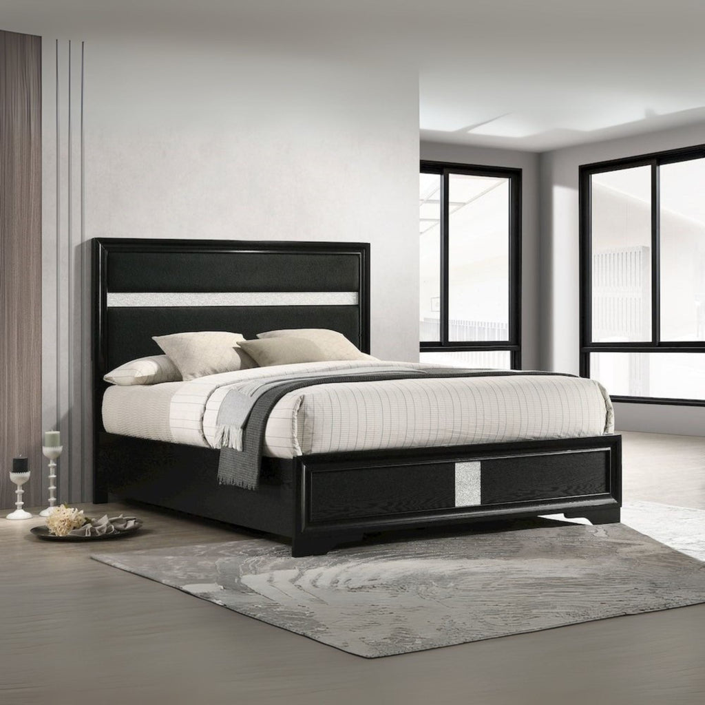Embrace tuxedo style with the dramatic black and sparkling trim featured on a modern wooden bed. Its simple silhouette brings elegant presence with a rectangular headboard complete with upholstered panels, foam cushioning and black fabric. Glittering trim adds sparkle and elegance in a horizontal stripe on the headboard and vertical stripe on the footboard. The footboard adds a low profile, clean-lined touch, perfect for an open, airy bedroom. Thick side rails and bracket feet complete the bed to perfection.