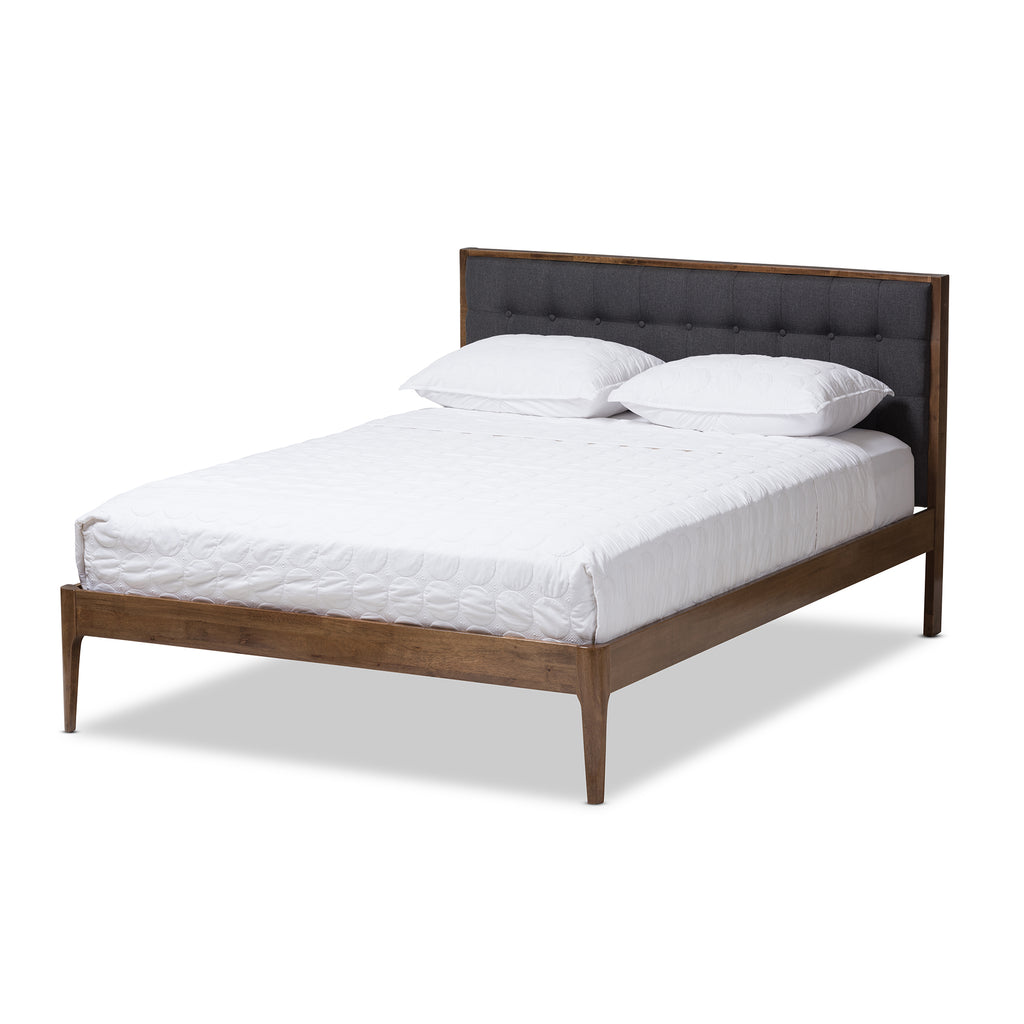 Transform your bedroom into a stylish sanctuary with the Jupiter King Platform Bed. This bed offers a mid-century feel, featuring a tailored fabric upholstered headboard and sleek tapered legs that enhance any decor.