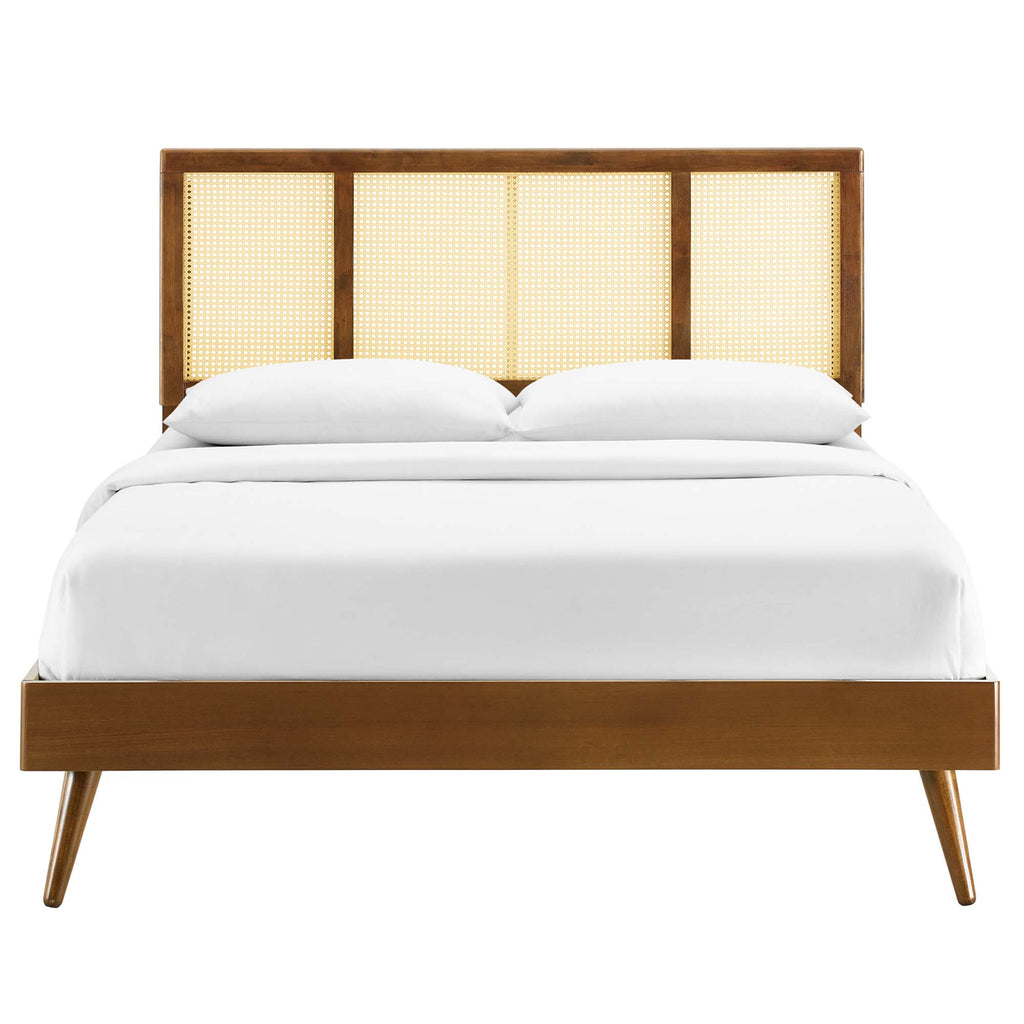 Infuse modern style into your master bedroom or guest room decor with the retro detail and organic aesthetics of the Kelsea Woven Cane Rattan Wood King Platform Bed. Bringing an airy, organic aesthetic to the bedroom, the king size headboard of this wood bed combines mid-century modernity and tropical style with its beautiful cane pattern and natural wood. This platform bed frame is a sturdy addition to the bedroom with a durable wood, MDF, and veneer construction and splayed rubberwood legs. Eliminating the need for a box spring, this king bed is complete with a wood slat support system, reinforced center beam, and supporting legs that make it a lasting mattress foundation for memory foam, latex, innerspring, and hybrid mattresses. Assembly required. King Bed Frame Weight Capacity: 601 lbs.
