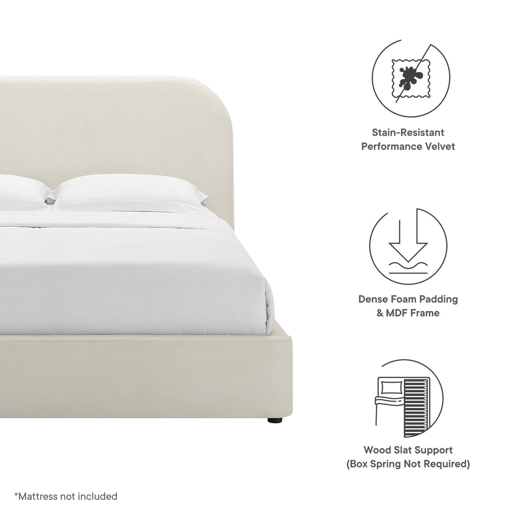 Delight in the upscale serenity of the Keynote queen size bed frame. Cloaked in stain-resistant performance velvet and filled with dense foam, this queen upholstered bed adapts to various decorative themes, making it an excellent choice as a spare bed or primary bedroom bed. Boasting a gently curve shaped headboard, it features a cloud bed frame design that subtly extends beyond the mattress's edge. The robust MDF construction and wooden slat base of the Keynote upholstered platform bed frame makes the use of a traditional box spring redundant, making it compatible with all types of mattresses, such as memory foam, innerspring, latex, and hybrid. Each queen upholstered bed stands on practical and durable LVL legs, equipped with non-marking caps to protect floors. The soft queen bed frame of the Keynote platform bed, complete with an elegantly upholstered headboard, offers a modern and contemporary upgrade to any bedroom setting. Mattress not included. Assembly required. Queen Size Bed Frame Weight Capacity: 800 lbs.