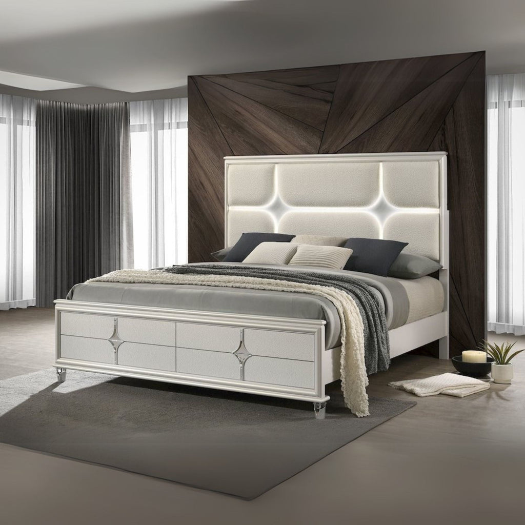 Latisha Olivia Eastern King Panel Bed Pearl White Boucle LED Headboard – Modern Upholstered with 3D Star Channel Lighting