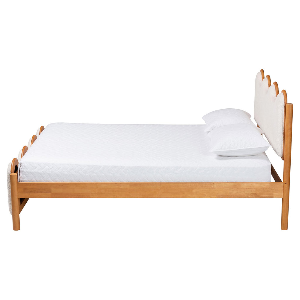 Characterize your bedroom with the timeless refinement of the lovely Lilia platform bed. Made in , this Mid-Century Modern piece consists of a sturdy wood frame with upholstered sections beautifully adorned with plush boucle fabric. The scalloped border of its headboard and accent footboard creates a captivating display rich with soothing geometry. The Lilia requires assembly and utilizes wood slats for mattress support, eliminating the need for a box spring. Rounded posts lend a distinguished silhouette, making the Lilia platform bed a wonderful bedroom centerpiece.