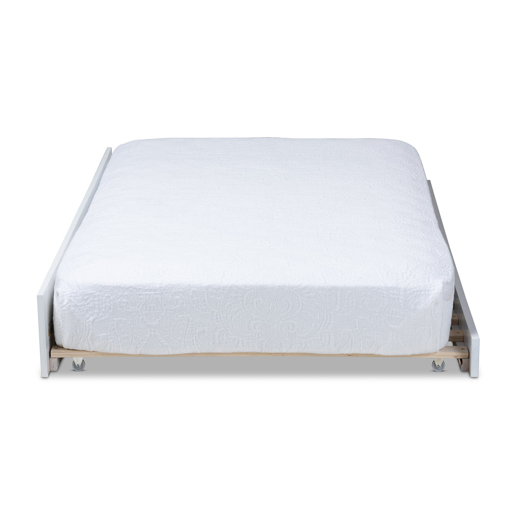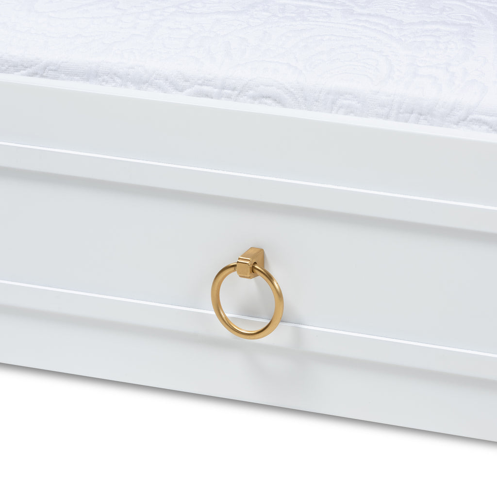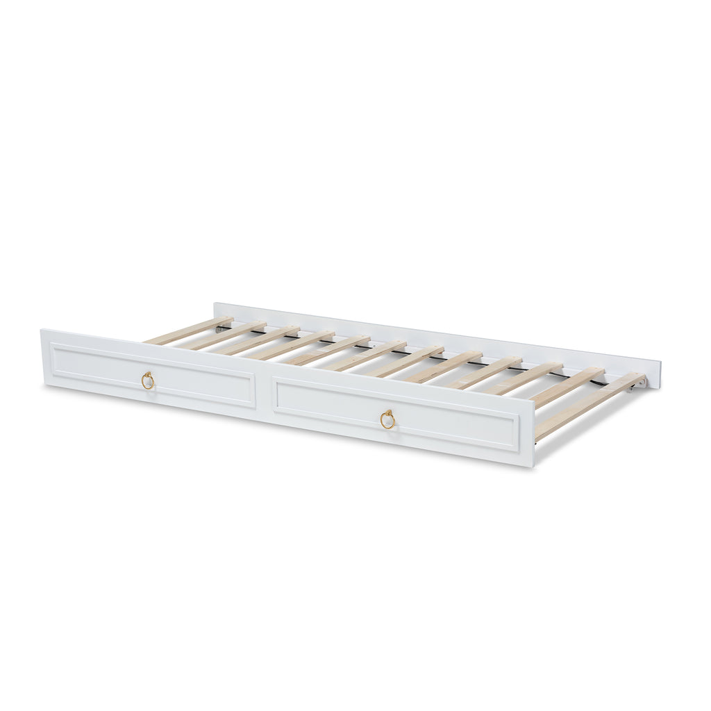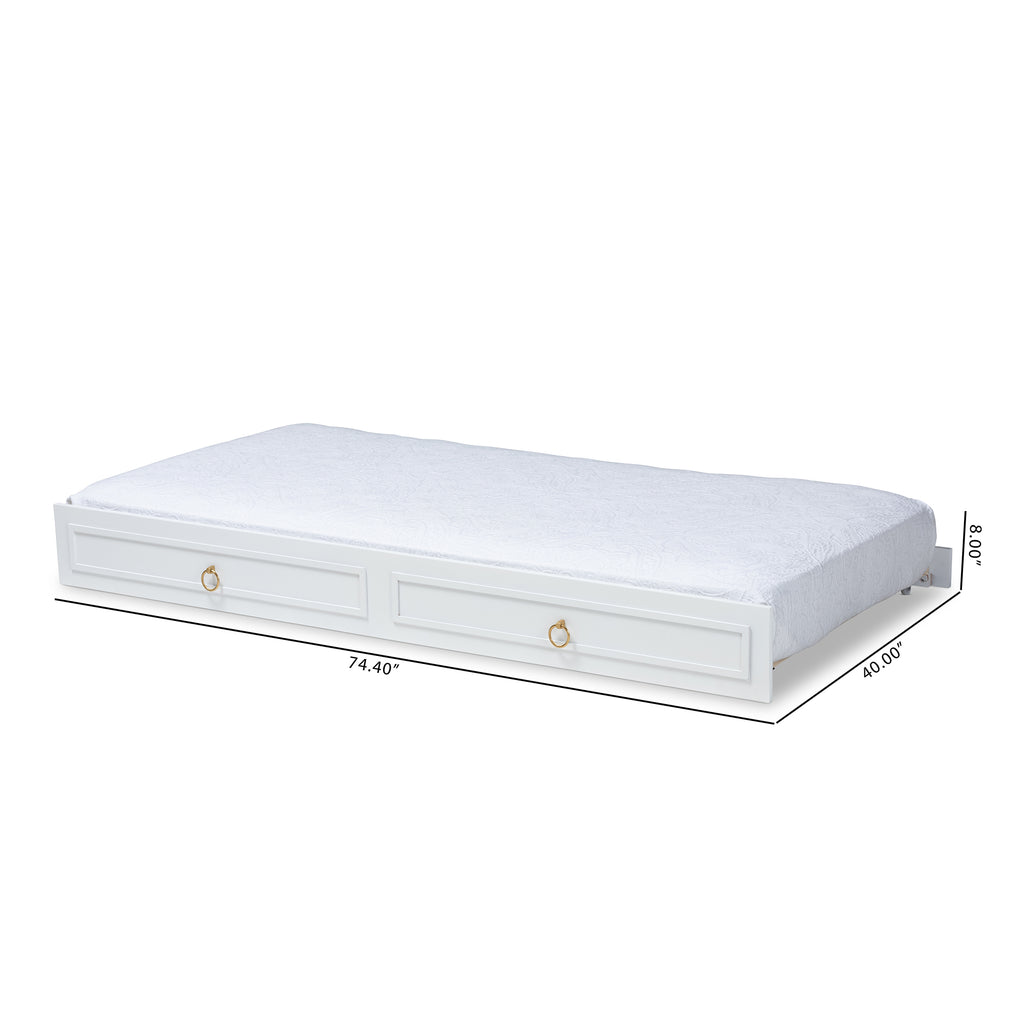Hosting overnight guests is easy with the Mariana trundle. The Mariana is fitted with four wheels to function as a roll-out trundle underneath a twin size bed frame. Its traditional design features two imitation drawer faces with gold-tone metal ring pulls. Constructed from wood, the Mariana displays an white finish that complements many bed colors. This trundle is designed for use with one twin size mattress. The Mariana trundle is made in and requires assembly.