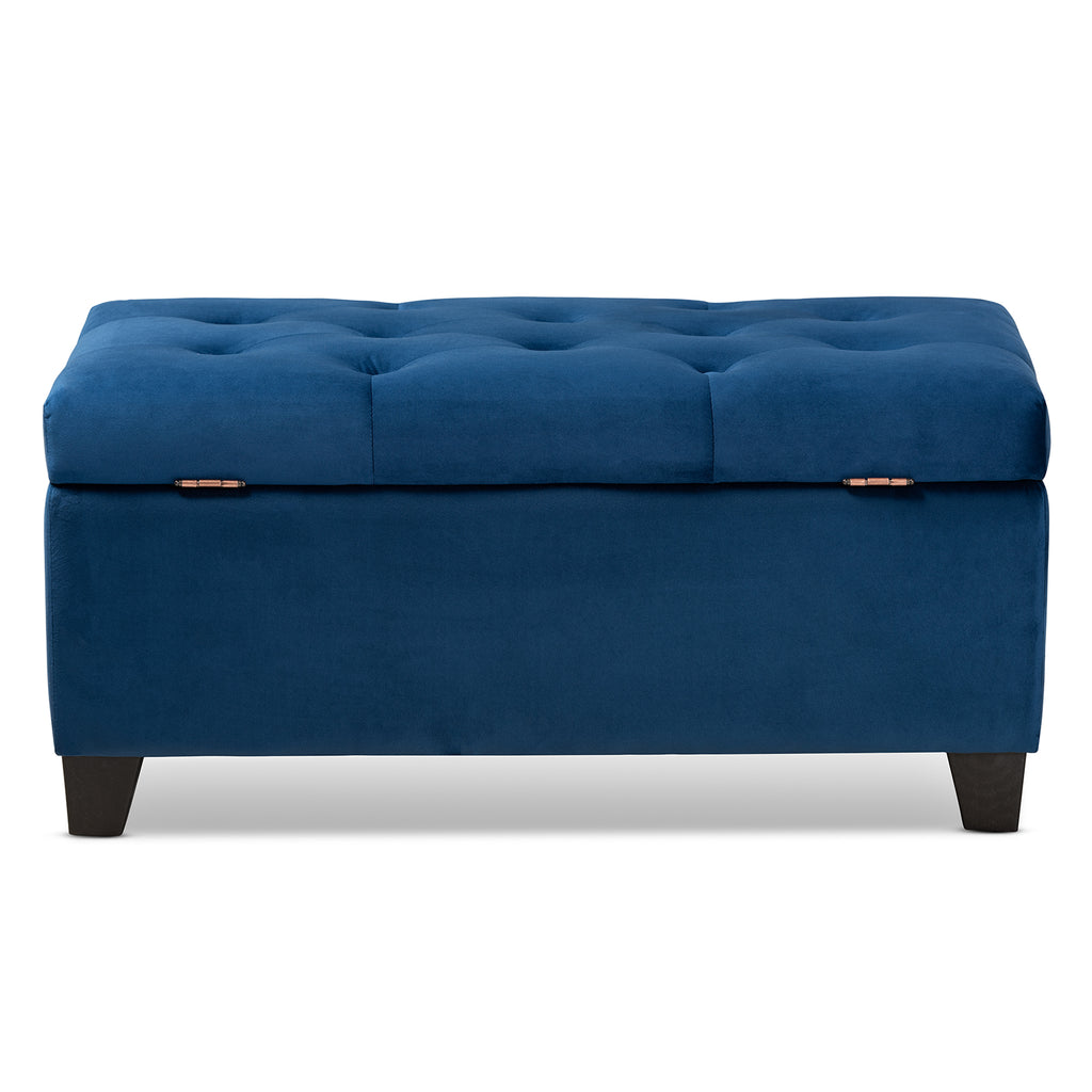 Cute, sturdy, and practical, the Michaela storage ottoman can meet a wide range of your organization needs. The modern and contemporary-inspired design emphasizes a simple silhouette and texture. The ottoman is upholstered in a rich velvet fabric, with a foam-padded, button-tufted lid. Ample storage space is located beneath the lid, made secure with a spring hinge. Black finished polymer feet complete the look. Use this ottoman as a decorative piece at the edge of a bed, as storage in the guest room, or as storage for shoes and toys in your entryway. The Michaela storage ottoman requires assembly.
