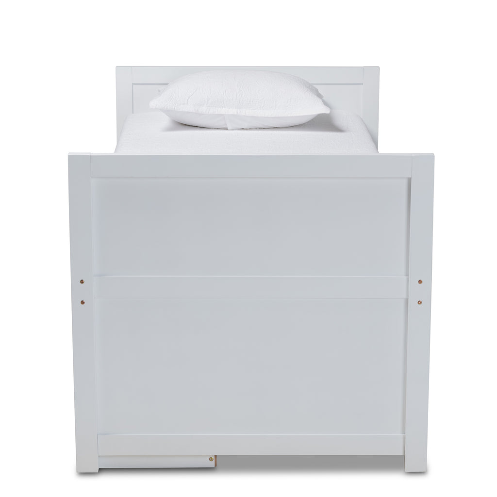 The Mirza bed redefines versatility, serving as a bed, dresser, and desk all in one! Made in , this wooden storage bed features a sleek white finish that brightens up any space. With five spacious drawers, you’ll have plenty of room to store clothes and other essentials, while an open shelf provides a spot for displaying your favorite books. Designed with functionality in mind, the Mirza is equipped with two pull-out panels that can be used as either shelves or a desk. The clean white finish and gold-tone metal hardware add a modern touch, while inset detailing brings a refined elegance. This bed requires assembly and is the ideal choice for any kid’s room.