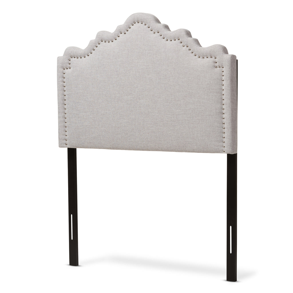 Complete your bedroom interior with the Nadeen fabric upholstered headboard. Constructed of solid rubberwood and MDF, the Nadeen twin size headboard is upholstered in greyish beige polyester fabric. Featuring curvaceous design with silver nail heads trim for a look, the Nadeen offers a touch of modern sophistication. Mounting wood post is made from rubberwood for and strength. The wood posts, featuring 5-level adjustable to the headboard and 2-level adjustable to the bed frame provide more flexibility for you to configure the height of your bed. Traditional adjustable metal bed frame such as Leggett and Platt bed frame will work well with the headboard. Cushioned headboard provides softness and shape, allowing you to rest ably. the Nadeen requires assembly.
