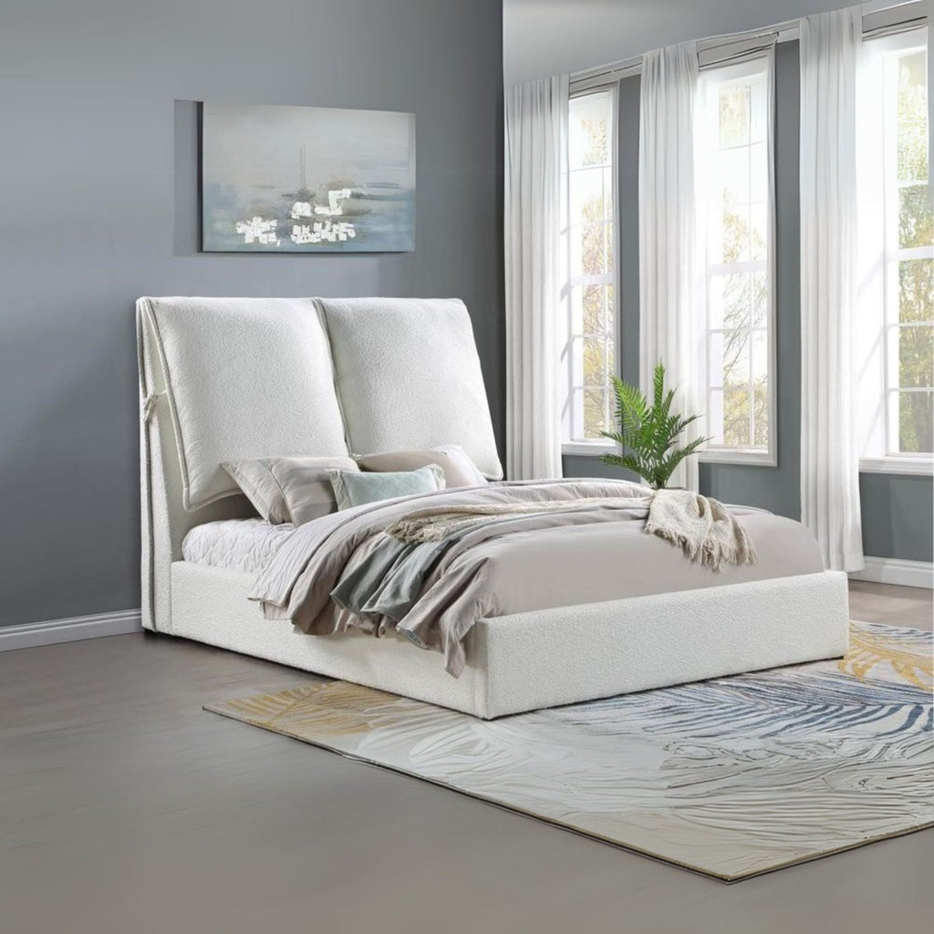Embrace and style with the King Platform Bed from Coaster, featuring plush upholstery in trendy and soft boucle fabric that fully covers the frame. This inviting bed is designed to make you feel cozy while adding a modern touch to your bedroom.