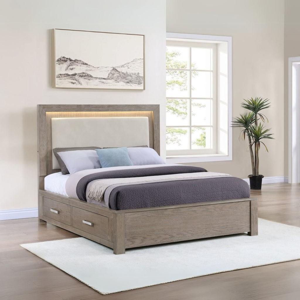Make the most of every inch in your stylish bedroom with a modern four-drawer wooden bed that includes an upholstered headboard with LED lighting for easy ambiance. The bed boasts a barley brown finish over wood grain details, creating a soft, neutral palette with organic flair. Four drawers are tucked underneath platform slats, creating ample storage that's for everything from clothing and linens to personal items. The bed is defined with a squared headboard that features an upholstered panel with foam cushioning and beige upholstery, for lounging with a book or movie. Built-in LED lighting is a complement, adding soft, inviting ambiance in your bedroom.
