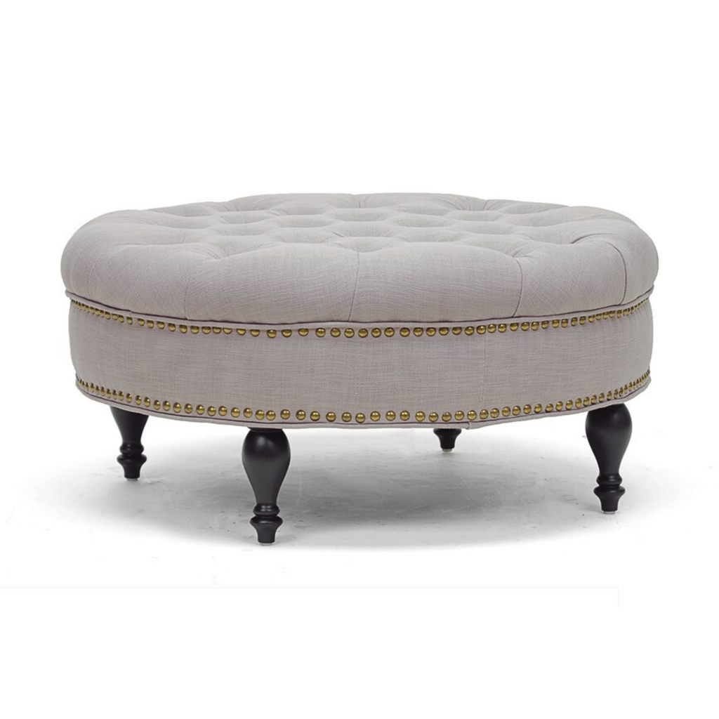 With its elegant button tufting and black turned wood legs, the Palfrey Upholstered Ottoman brings instant sophistication to any interior. Crafted in China, this modern ottoman features a sturdy eucalyptus wood frame, supportive foam cushioning, and soft beige linen upholstery. Antiqued brass nailhead trim accents the sides for a classic finishing touch. The Palfrey Round Ottoman requires minor assembly and should be spot cleaned as needed. This design is also available in dark gray and sold separately.