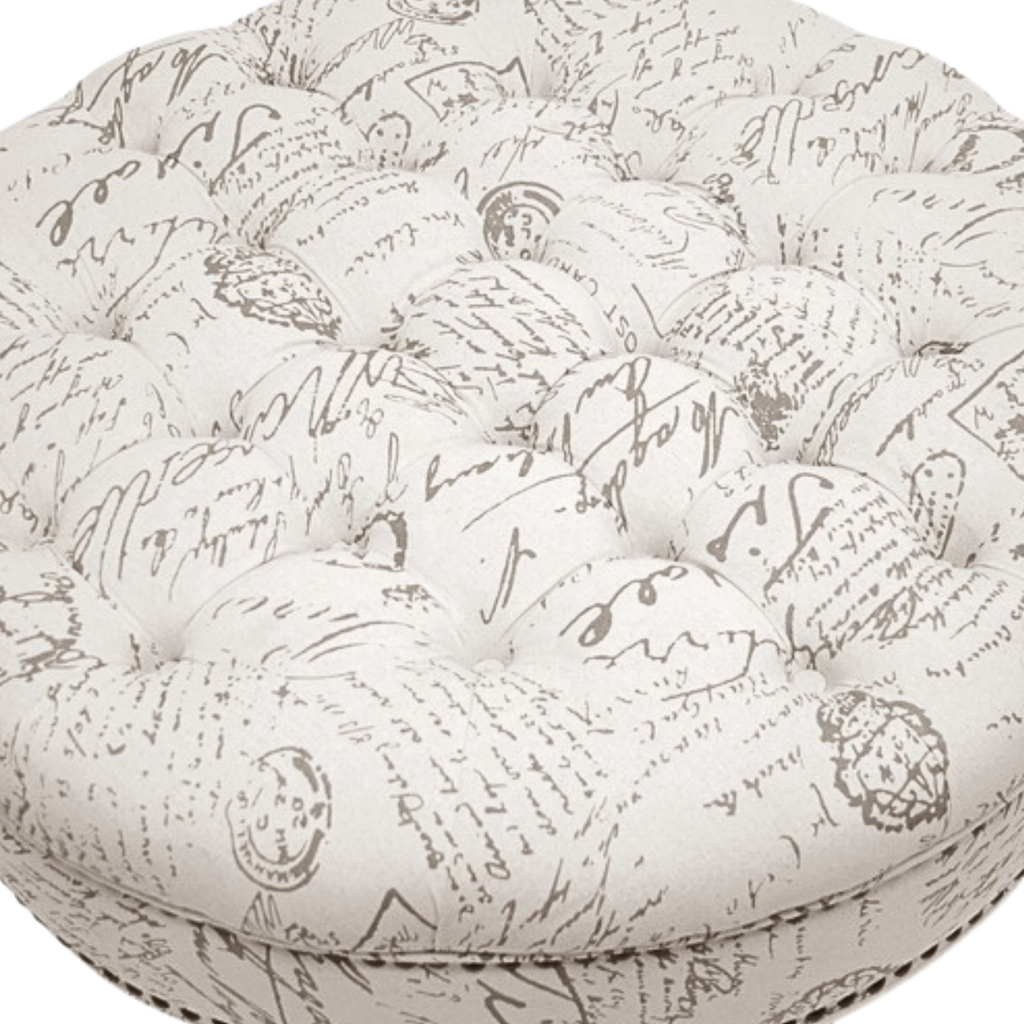 Featuring button tufting and black turned wood legs, the Palfrey Upholstered Ottoman brings instant sophistication to any living space. Crafted in China, this elegant modern ottoman is built with a sturdy eucalyptus wood frame, supportive foam cushioning, and soft beige linen upholstery. Antiqued brass nailhead trim accents the sides for a touch of classic charm. The Palfrey Round Ottoman requires minor assembly and should be spot cleaned as needed. This design is also available in dark gray and sold separately.