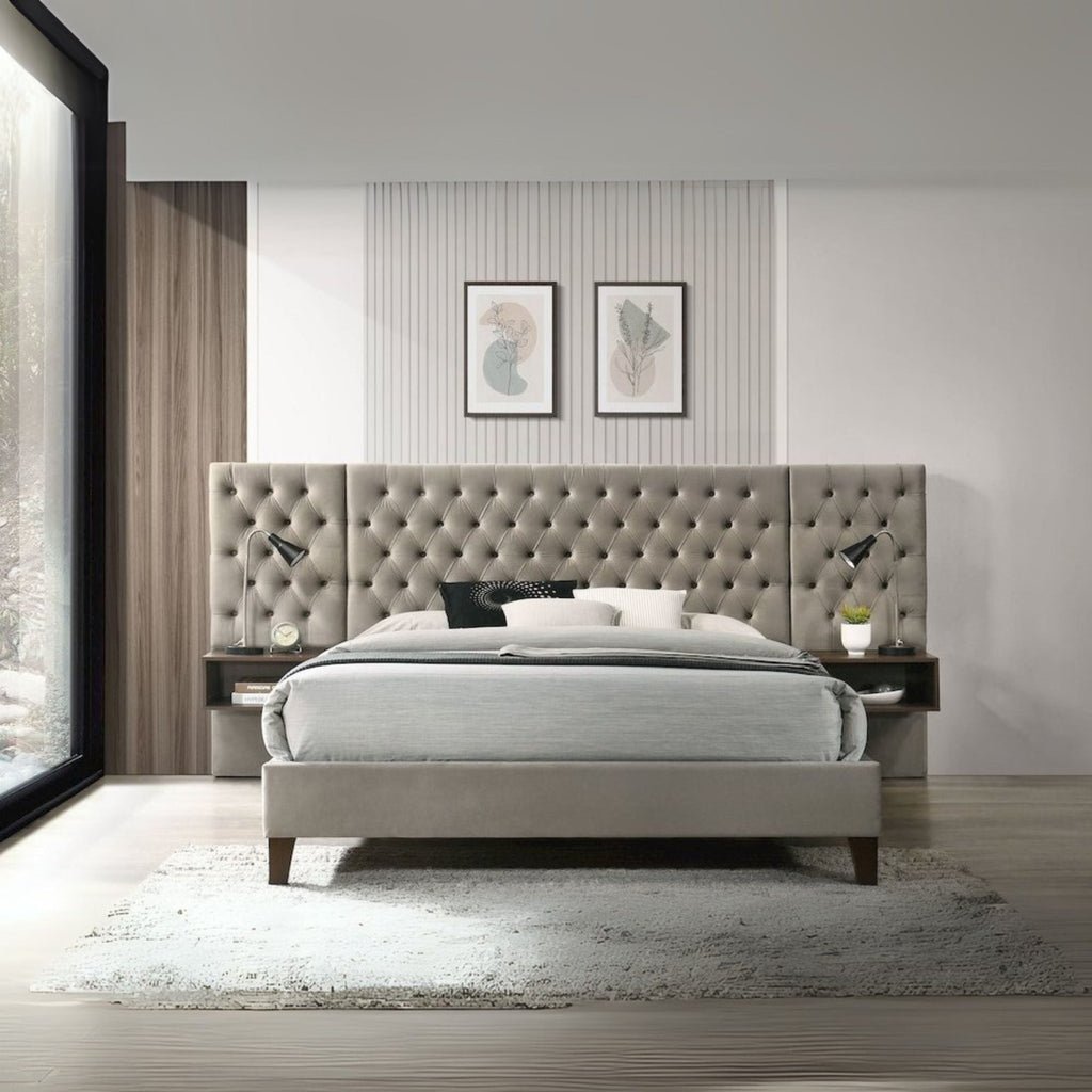 Upgrade to the refined style and inviting sophistication of a modern upholstered bed. Designed to impress while offering a welcoming retreat from the world, the bed features light brown fabric with deep button tufting in a diamond pattern that creates wonderful texture and dimension. The three-panel design includes floating nightstands, ensuring bedside storage while maintaining a light, airy ambiance in your bedroom. The nightstands are open cubes, each in a rich brown finish with a wood look, ly complementing the silhouette of the bed. Classic upholstered rails complete the look while tapering legs ensure support and stability.