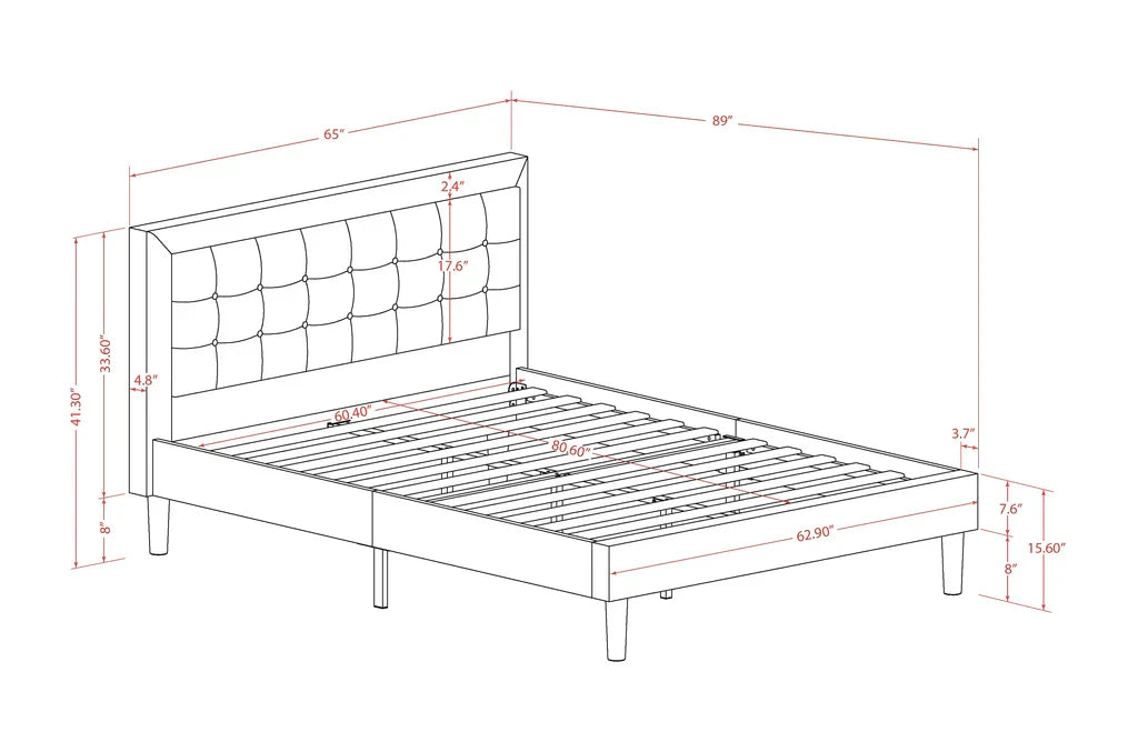 - Dimensions of queen bed: length: 83.7; width: 59; height: 41.3.