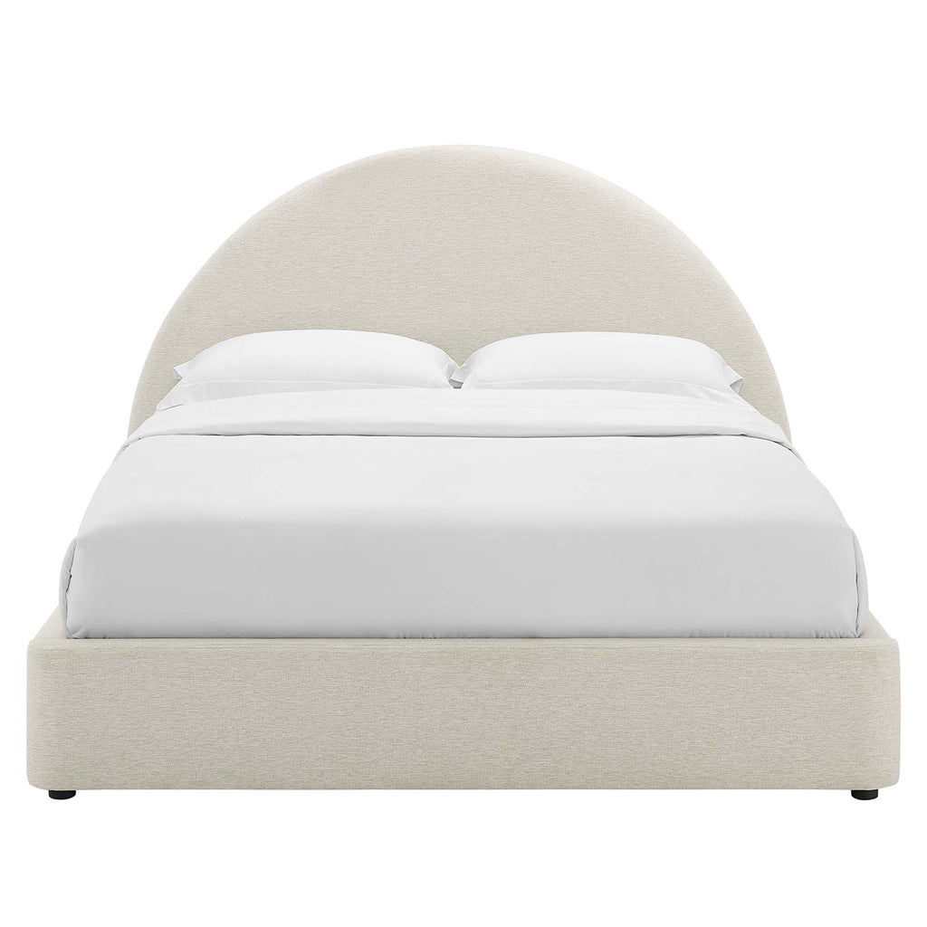 Step into a world of cozy with the Resort king size platform bed. This king bed features a unique arched headboard that brings a fresh perspective to a primary bedroom or a spacious guest suite. Upholstered in woven heathered fabric and cushioned with dense foam, this king platform bed frame fits various decor styles and offers the characteristic of a cloud bed. The MDF frame of this upholstered platform bed, equipped with a wood slat support system, removes the necessity for a box spring. Its minimalist bed frame makes the Resort arch shaped round bed great for memory foam, innerspring, latex, and hybrid mattresses, providing sturdy support. Outfitted with LVL legs, each king bed frame with headboard comes with non-marking caps to safeguard your floors, blending strength with a sleek, contemporary appearance. Mattress not included. Assembly required. Bed Frame King Size Weight Capacity: 800 lbs.