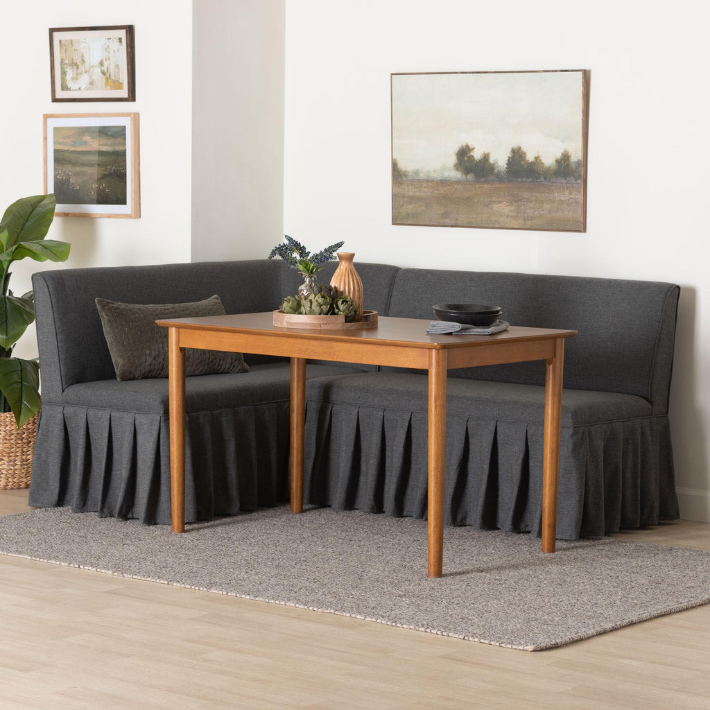 Maximize the potential of your space with the easygoing elegance of the Richard dining nook set. Made in Malaysia, this modern set consists of one bench, one corner bench, and one dining table crafted from sturdy wood. Each bench is upholstered in sumptuously soft fabric and is embellished with a pleated skirt for a display rich with flowing elegance. The Richard requires assembly and features a broad, rectangle tabletop with broad edges to accommodate each member of the table. Imbued with cozy refinement, the Richard dining nook set is a fantastic arrangement.