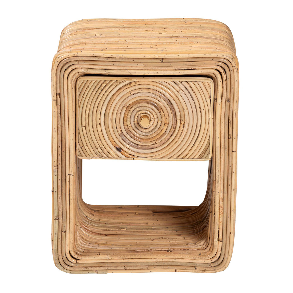 The charisma and convenience of paradise graces your bedside in the form of the lovely Rosina nightstand. , this bohemian piece is handcrafted from natural rattan by skilled artisans. The drawer offers secure storage of all your nightly essentials while the open shelf accommodates larger items. The Rosina will arrive fully assembled and is adorned with a metal drawer knob that draws attention to the beautifully geometric of the laminated rattan. An efficient and beautiful accessory, the Rosina nightstand uplifts any bedroom.
