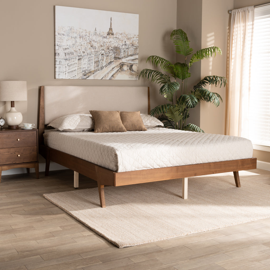 Convey a calm, relaxing ambiance in your bedroom with the lovely Senna platform bed. , this bed is constructed from sturdy wood. The headboard is padded with plush foam and upholstered in smooth polyester fabric for exceptional when sitting up in bed. The Senna requires assembly and features wood slats for mattress support, which eliminate the need for a box spring. Angled legs lend a charming, mid-century feel, making the Senna platform bed a delightful addition to any bedroom.