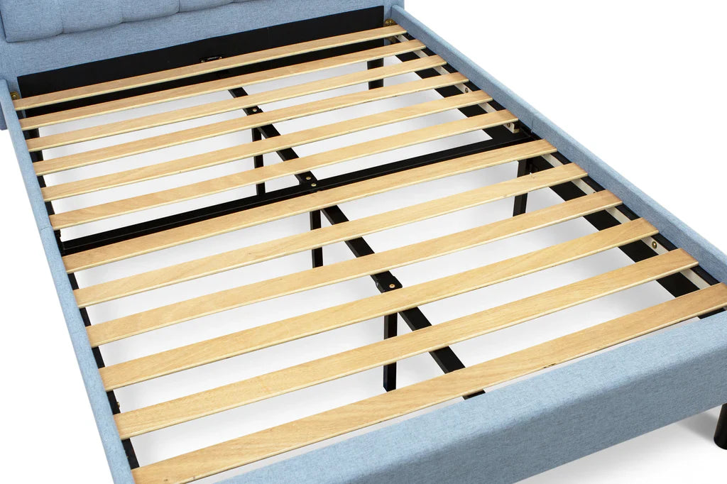 We are offering a gorgeous Denim Blue upholstered panel bed for your wonderful bedroom. The compact design adds a contemporary touch to your space. This full size bed is especially suitable for small spaces. We have constructed this panel bed for both sturdiness and style. We have constructed these Bed slats by using Engineered wood to create strong support for you and your mattress. The step by step Assembly instructions for the headboard, footboard, wood slats and other accessories are all in the package, you will be able to do assemble these in a short time. Our panel headboard is quite easy to clean and always gives a great appeal.