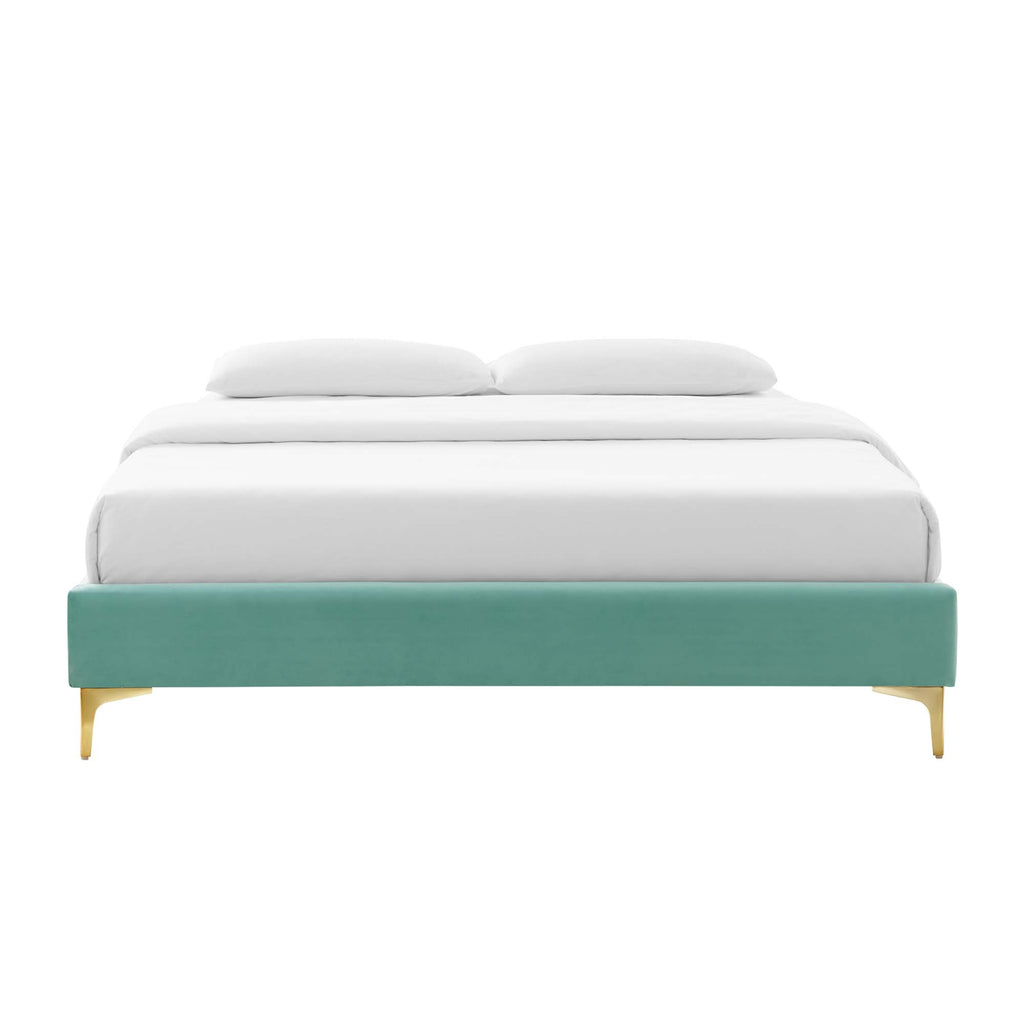 Uplift your master bedroom or guest bedroom decor with the Sutton Performance Velvet King Bed Frame. A King size bed frame covered in stain-resistant performance velvet, this upholstered bed frame is a sturdy mattress foundation for memory foam, innerspring, latex, and hybrid mattresses. Eliminating the need for a box spring, the MDF frame of this King bed is complete with a wood slat support system crafted with poplar for lasting durability and support. This slatted bed frame rests on gold metal legs with non-marking foot caps and includes a reinforced center beam with two support legs for enhanced stability. The Sutton Bed Frame is compatible with a variety of different headboard styles, or makes a statement as a stand-alone piece in the bedroom. Bed frame interchangeable with Paige, Alyson, Angela, Veronique, Evelyn, Dawn, Cecilia, Lucia, Rosalind, Delilah, Greta, Louisa, Eloise, Daisy, Sadie, Sloane, Fallon, and Lizzy. Mattress not included. Assembly required. King Size Bed Frame Weight Capacity: 800 lbs.