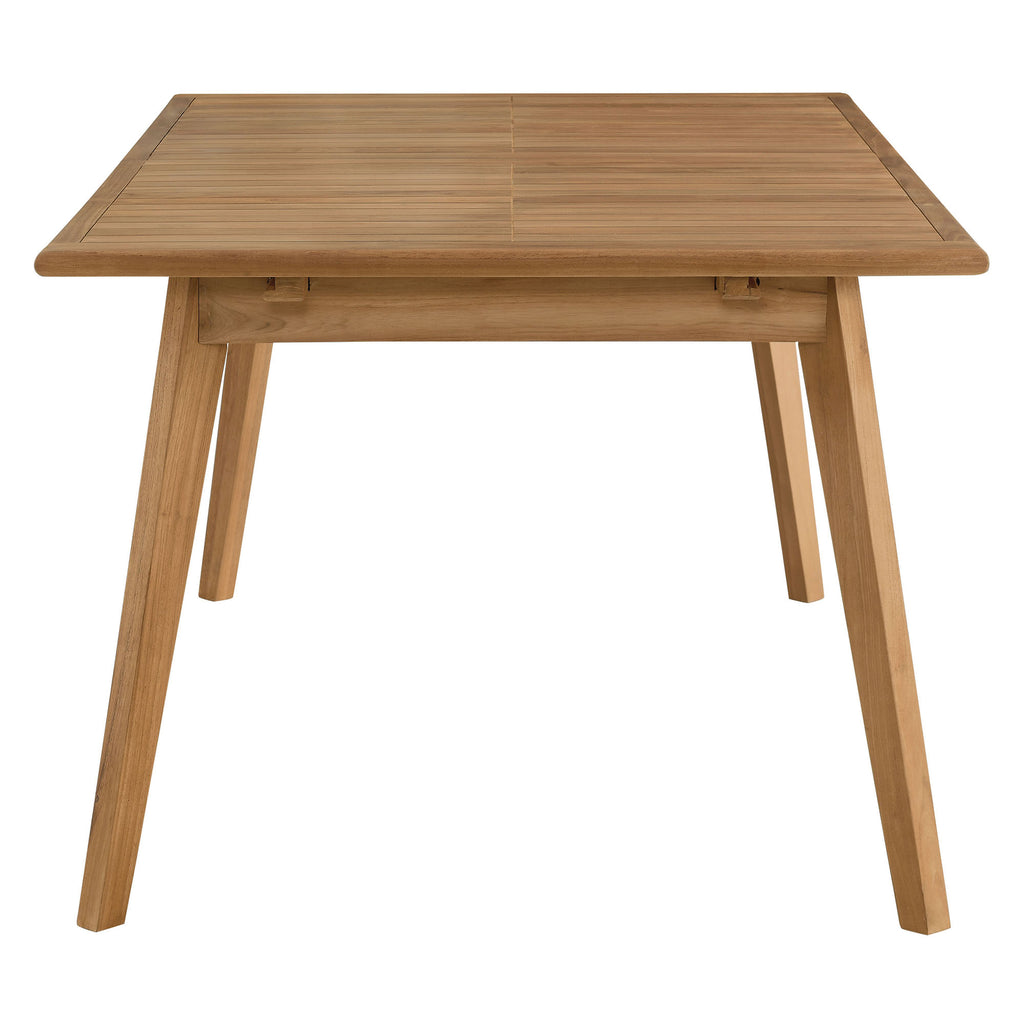 Refresh your outdoor dining experience with the Vienna Extendable Teak Dining Table, an exquisite addition that seamlessly accommodates larger gatherings along with everyday outside dining. This large outdoor dining table, crafted from beautiful teak wood that is naturally weather-resistant, features a slatted surface that enhances its visual appeal and ensures it stands out, no matter the weather. Conveniently, this outdoor dining table for 6-8 people extends from 71" to 94.5", making it perfect for hosting more guests or adjusting to fit your outdoor patio needs. Add to that its trendy tapered legs and the Vienna Teak Wood Dining Table offers exceptional stability, easily supporting meals, drinks, and dining essentials. Whether paired with the complete Vienna Outdoor Teak Wood Dining Set or mixed with other outdoor patio furniture, this extendable dining table complements a diverse range of outdoor patios. Assembly Required.