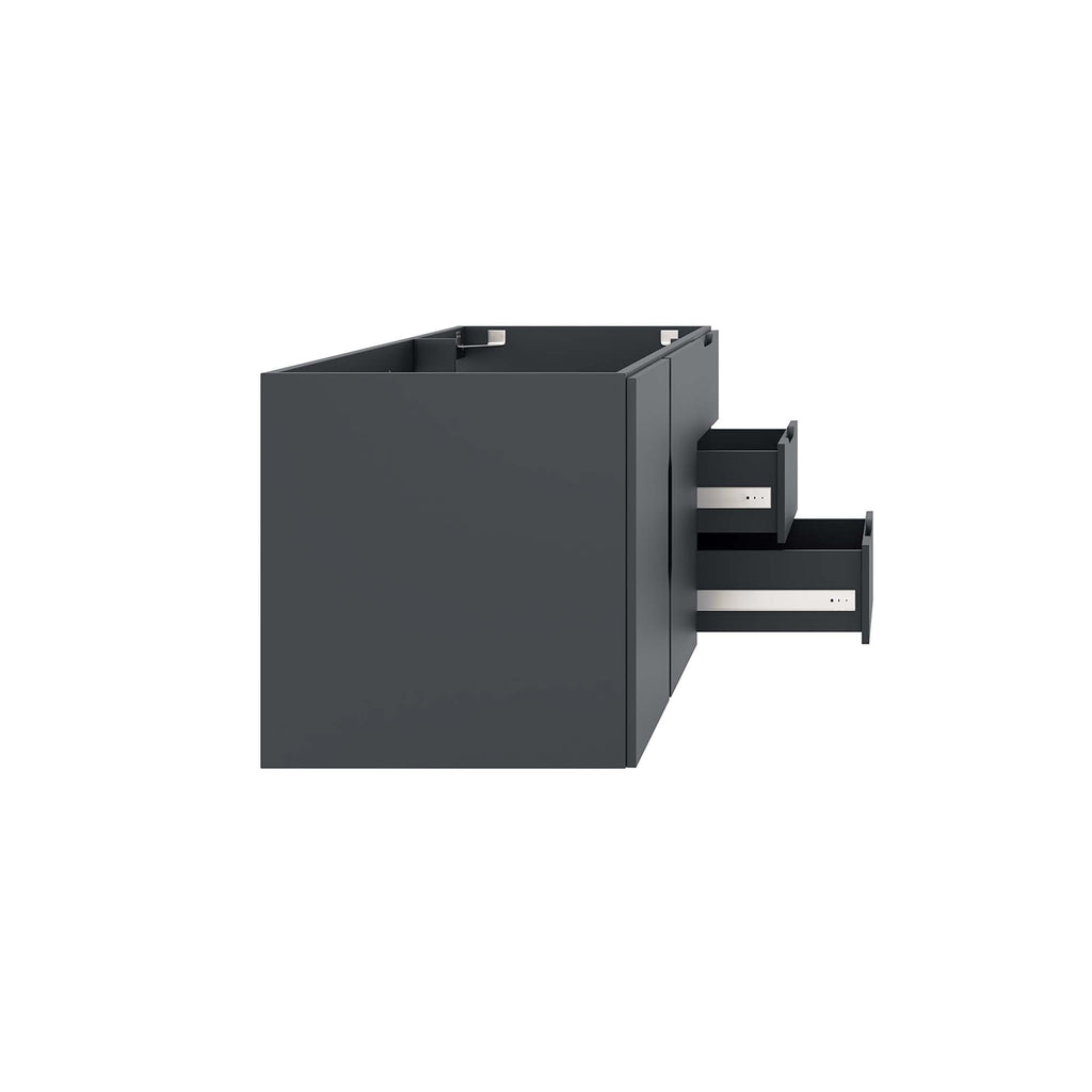 Energize your bathroom space with the modern design of the Vitality 48" Wall-Mount Bathroom Vanity. Boasting a sleek, clean-lined silhouette, this vanity is durably crafted with particleboard and MDF with a melamine finish. This vanity features a wall-mount design and is complete with ample storage space for all your bathroom essentials with two spacious drawers and an under-sink storage area behind two soft-close doors. This vanity boasts an open back design to accommodate plumbing. Sink basin and fixtures not included. Assembly required.