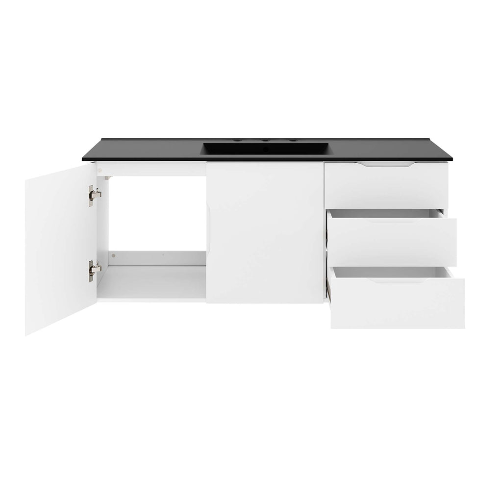 Energize your bathroom space with the modern design of the Vitality 48" Wall-Mount Bathroom Vanity. Boasting a sleek, clean-lined silhouette, this vanity is durably crafted with particleboard and MDF with a melamine finish. This vanity features a wall-mount design and is complete with ample storage space for all your bathroom essentials with two spacious drawers and an under-sink storage area behind two soft-close doors. This vanity is complete with a ceramic sink basin with 8-inch widespread holes and an integrated countertop. This vanity boasts an open back to accommodate plumbing. Fixtures not included. Assembly required.