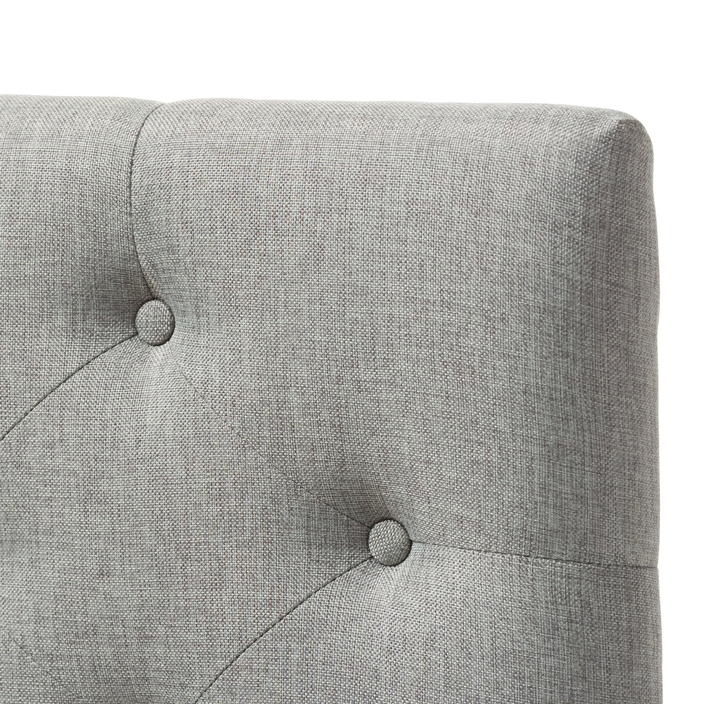 Straight lines and button-back detailing offers your space a plush symmetry with the Viviana upholstered twin headboard. Impart a unique elegance into your bedroom interior with this piece of furniture. The Viviana is constructed of hardwood frame and is cushioned with high density foam for softness and shape. For an ultra-elegant look, the grey polyester fabric upholstered headboard is button tufted to create the diamond shaped design. The headboard sits between the wall and the ensemble frame, attaching not to the bed base but to the legs, for The leg supports are invisible once set up and can be adjusted to suit the height of your ensemble for convenience. the headboard requires assembly.