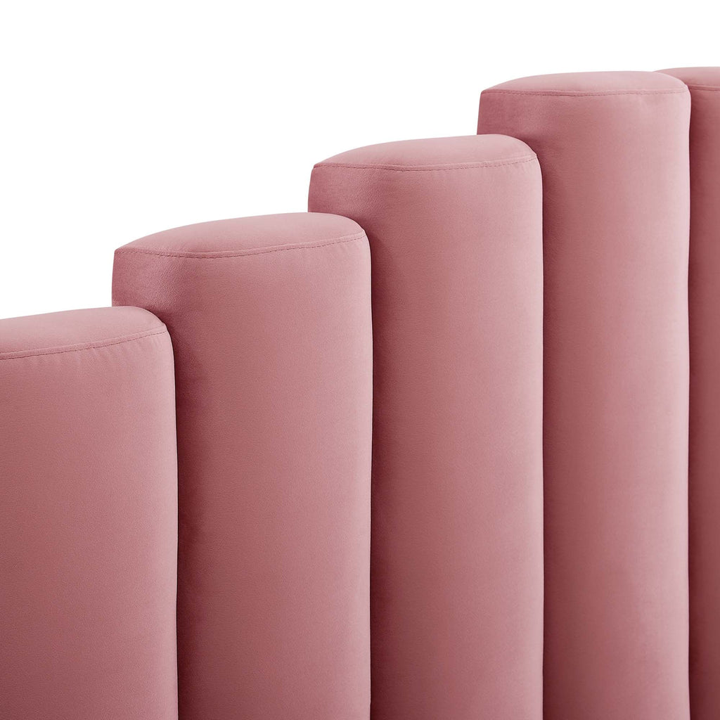 Instill style able in a master suite or guest bedroom with the Olivia Performance Velvet Queen Platform Bed. Abounding in style and vintage charm, the upholstered headboard of this queen bed features a modern twist on classic channel tufting with velvety panels ascending upwards in an arching design. The padded queen headboard and side rails come upholstered in soft, stain-resistant performance velvet upholstery. Resting atop gold metal legs with non-marking caps, this platform bed frame is a sturdy mattress foundation with a wood slat support system that eliminates the need for a box spring memory foam, latex, innerspring, and hybrid mattresses. Assembly Required. Bed Weight Capacity: 800 lbs.