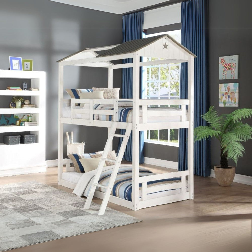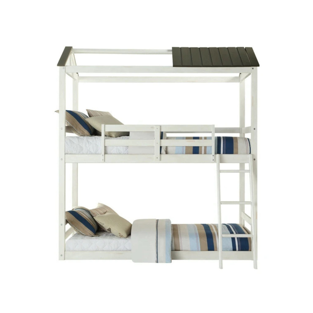 Give your children a space of their own with the Nadine cottage bunkbed. This unique wood twin over twin bunk bed s easy-access guardrails, a reversible front ladder and a decorative cottage themed roof over the top bunk. With a timeless weathered white and washed gray finish, this artistically imagined bed is expertly designed to withstand the test of time and provide your little ones with enduring and adventure.